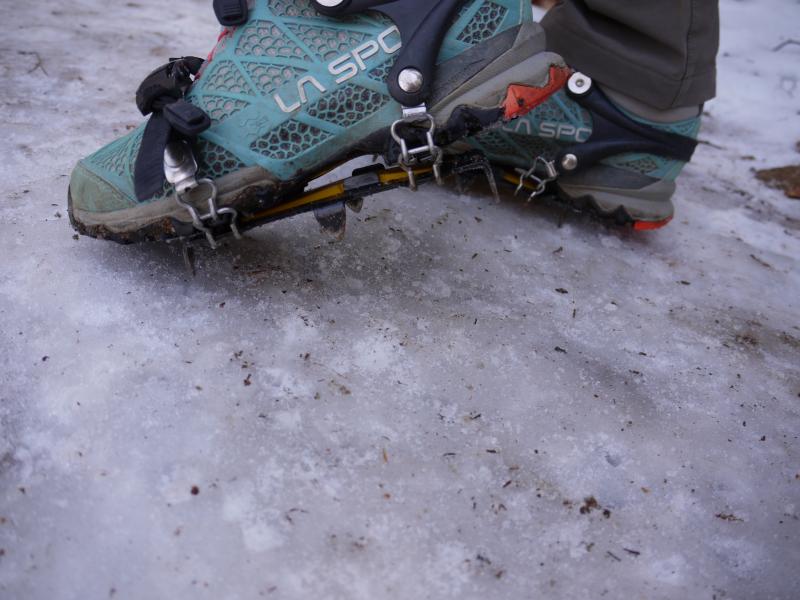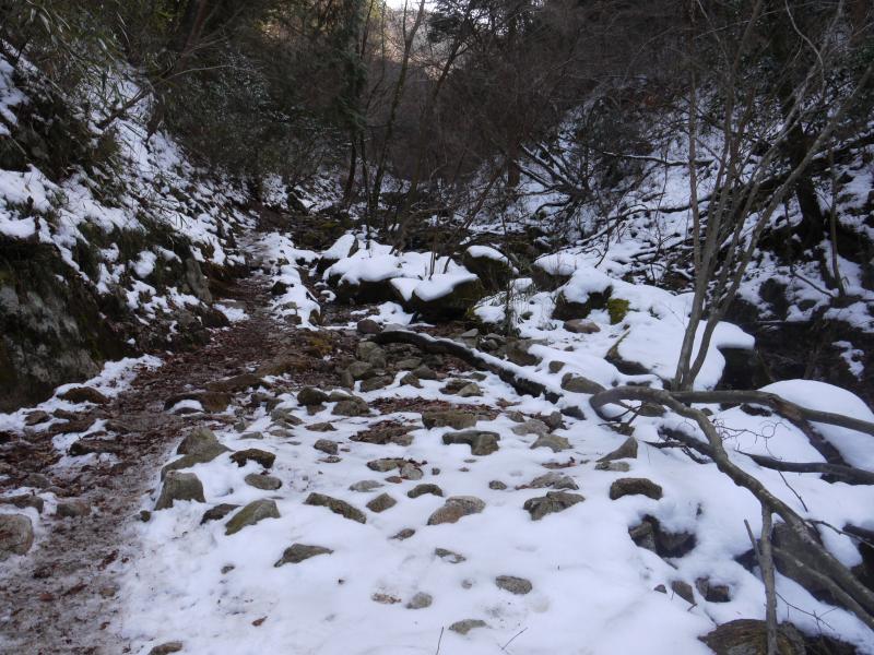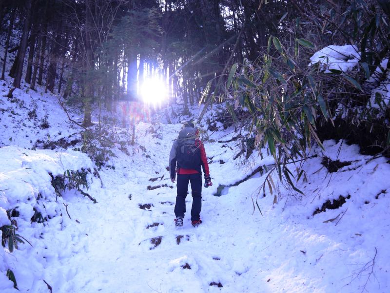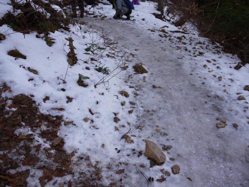 ・日当たりのよくない登山道は積雪10cm程度。踏み固められて滑りやすいため軽アイゼンかチェーンアイゼンが必要です。積雪道と無積雪道が日当たりによって交互に現れます