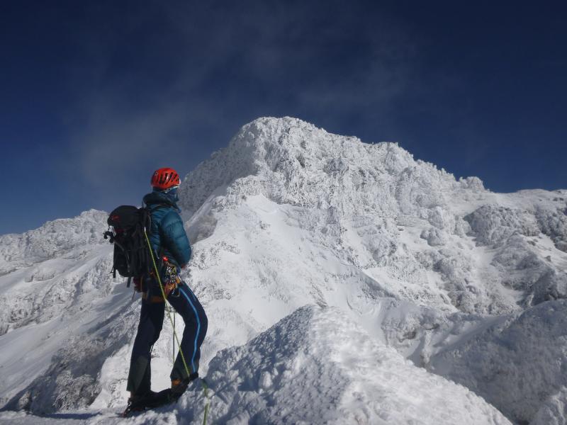 小同心の頭からは横岳主峰基部へコンテで移動し1Pのクライミングで山頂に出ます。