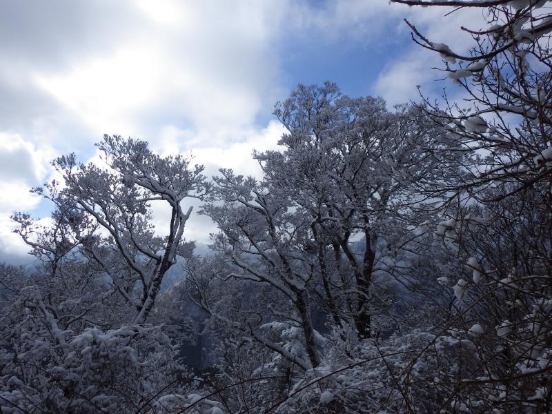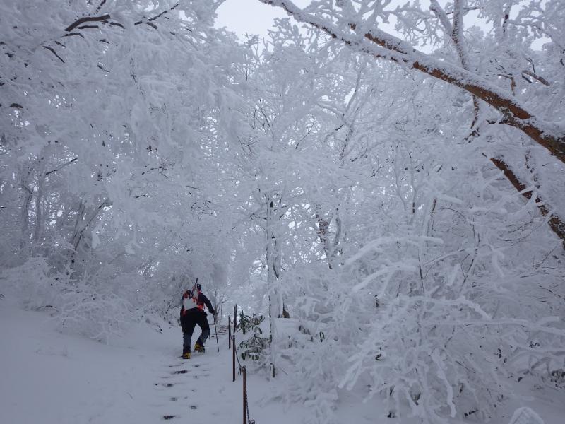 登山道だけでなく木々もだんだんと白く染まってきた。傾斜もキツイ。ぜぇぜぇ。