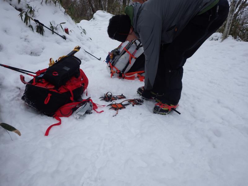 八丁鞍部まではひたすら下る。これぐらいの雪の深さと斜度ならチェーンアイゼンが歩きやすい。鞍部からはいよいよ登攀が始まるので12本爪に変更。久しぶりのアイゼン。歩き方がへたくそだ。踏みだしてもづるづる滑る、、、前爪をきっちりきかせて、歩幅を広くして、転ばないように。。。