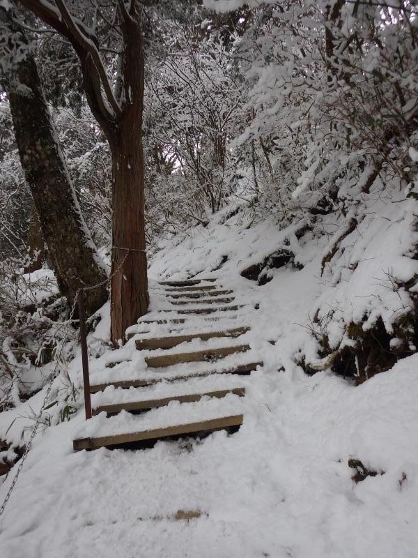 ロープーウェイを降りてから私はチェーンアイゼンを装着した。雪はそれほど深くなく柔らかいのでノーアイゼンでも登れそうだが冬靴は靴底が硬いので装着したほうが歩きやすい。成就社で登山の安全をお願いして出発。