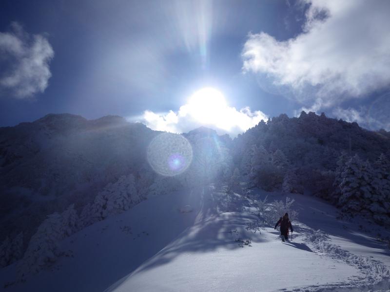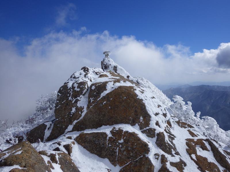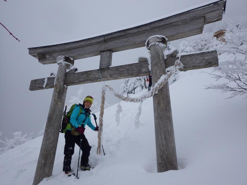 慎重に慎重を重ねつつ、どんどん増える雪と霧氷とに高揚感あげあげで山頂に到着!!!だが残念ながら天狗岳は見えない。それでも山頂到着にわいわいしていると雲が切れる瞬間が。あっ、見えた!これは晴れるのか?ここまできて天狗に行かないの?とビビる私を旦那に焚きつけられ荷物をデポして天狗岳に向かう。しょっぱなの下りでまずおろおろ。それでもなんとかあるき始めると本格的に晴れてきた!うおーーー、最高だーーー。すごいすごいの連発。青い空と白い雪とはるか遠くまで見渡せる展望と、、、やっぱり雪山はたまらんね。無事天狗岳に到着し記念撮影。と、弥山に戻ってくるころはあっという間に曇り空。ついてる。