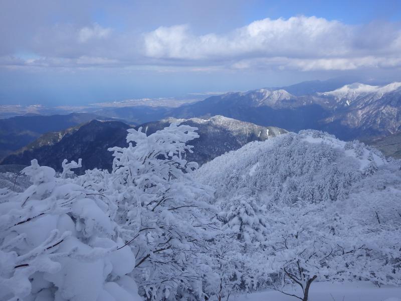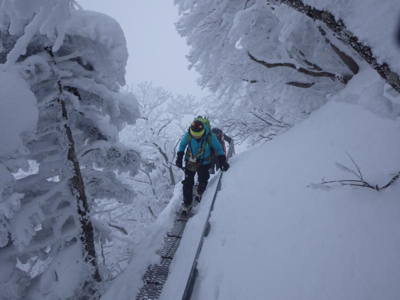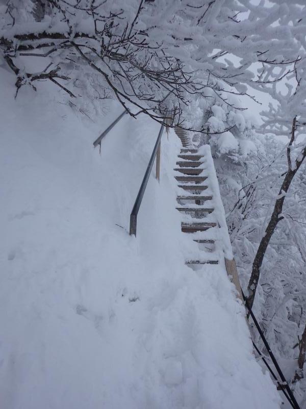 試しの鎖をすぎ休憩所を超えると夜明け峠。視界が開ける。一面銀世界だ。一瞬の晴れ間に海も見える。雲よ流れてくれ。二の鎖を過ぎると核心だ。鎖をトラバースするように巻いた登山道の階段が雪でうまり外側を慎重に歩かなくてはならない。キレ落ち度がハンバなく怖い。それでもトレースが付いていたのでありがたい。これがノートレースだったらどこを歩いていいのやら、、、良かった。