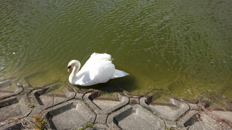 羽子の池には大きな白鳥が一羽いました。人に慣れている様子で、すごい速さで進んできたので、ぜんまい仕掛けかと疑いました。