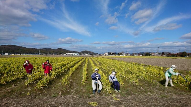 上から見下ろした菜の花畑の前を通ると、可愛い案山子がお出迎え(笑)