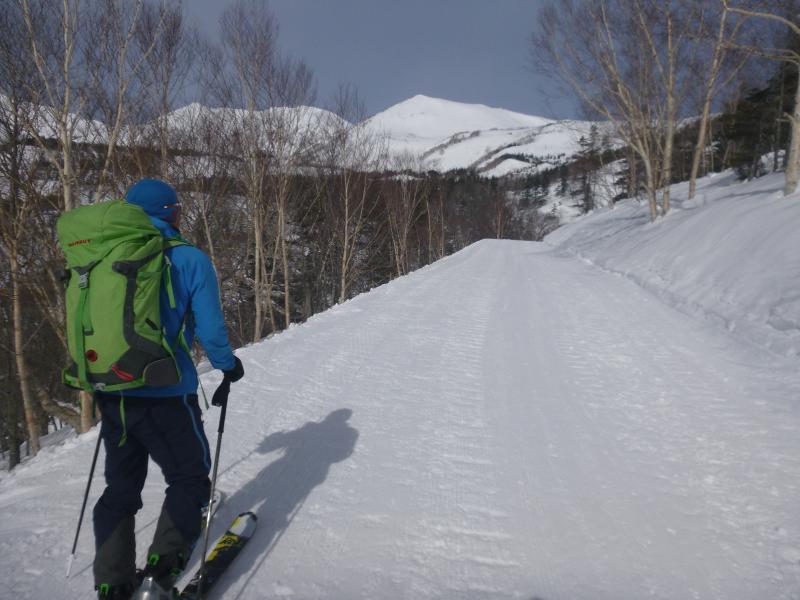 乗鞍の斜面を滑りきった後は、快適な雪を探しながら林道のあるロープウェイ駅へ。