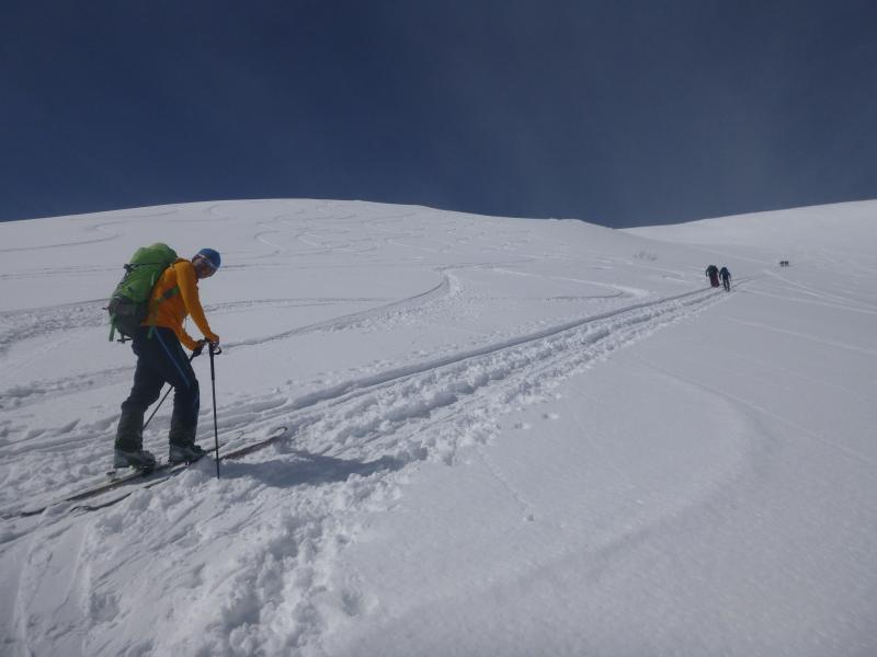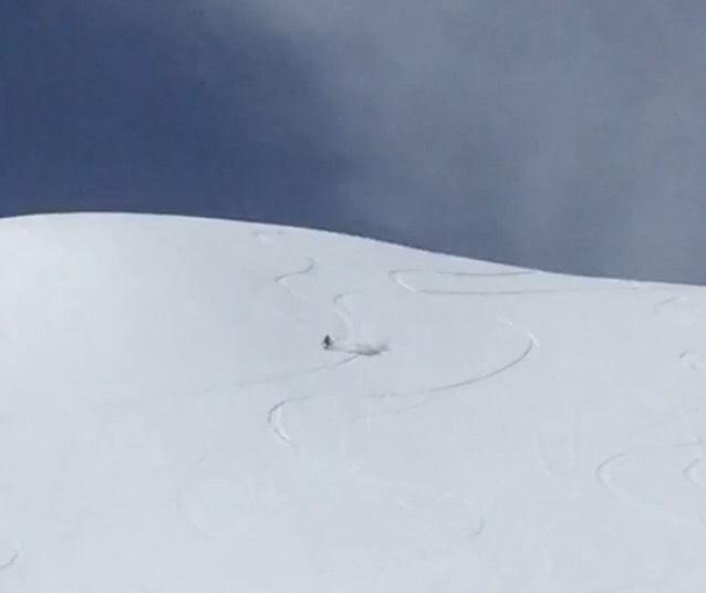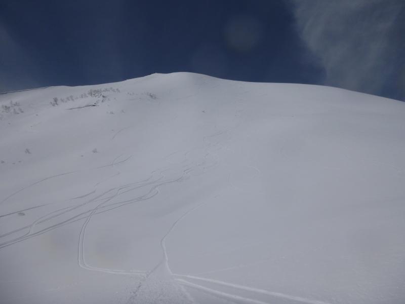 斜度は最大35度ほど、雪は少々重いけど快適にターンしていたら急にクラスト層が出てきて焦りました。