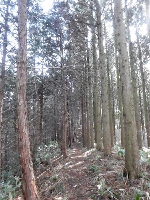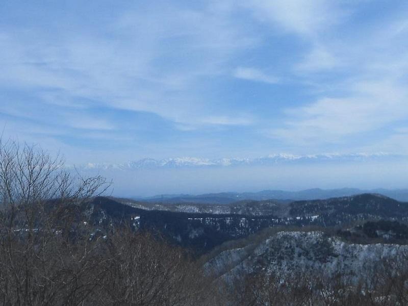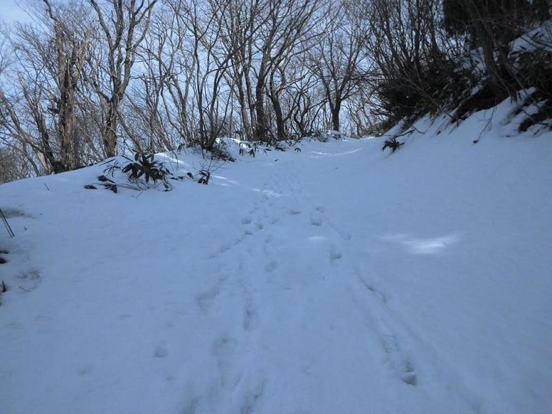 顕著な尾根を登っていきます、傾斜が少し出てきます。雪も少ないなりに増え、野兎?など小動物の足跡が結構ありました。途中からは林道歩きで退屈ですが、山の龍宮城には展望台があり、白山方面の展望はここが一番です。