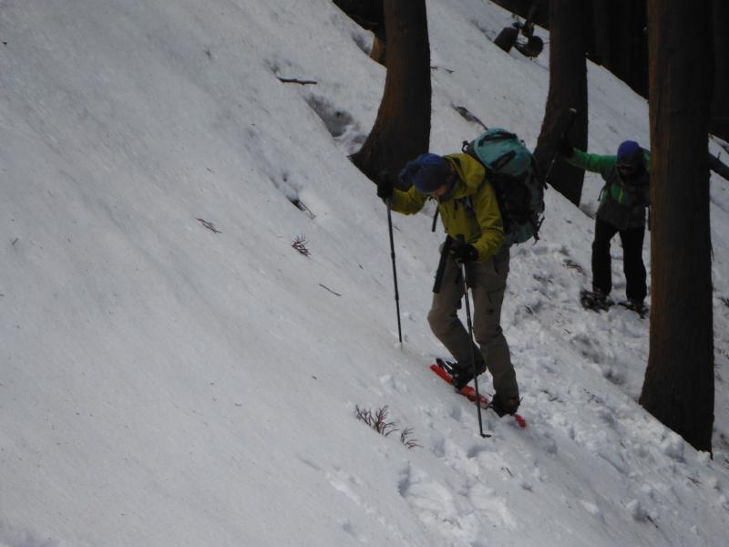 というのは、下山は登りと違う道を歩く予定だったのですが、歩きたい道を少し行き過ぎてしまいました。引き返せばよかったのですが、地図で方向は確認していたので、そのうち歩きたかった道に合流できるだろうと考えてスノーシューで進んだのですが、谷が想像以上に傾斜がきつく、なおかつ谷に水が流れていたため、林道に出るまでひたすら雪の片斜面をズルズルと歩く羽目になりました。