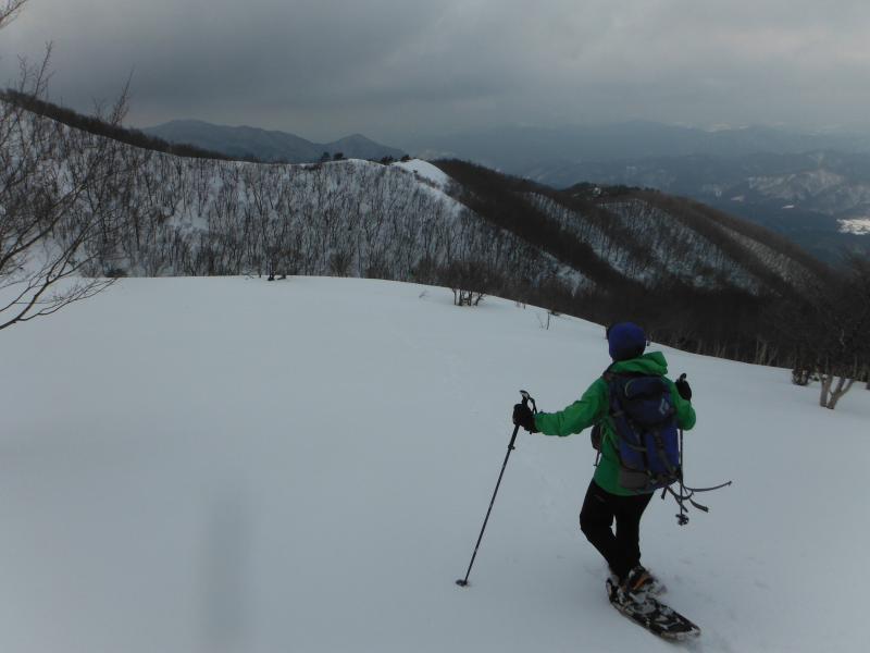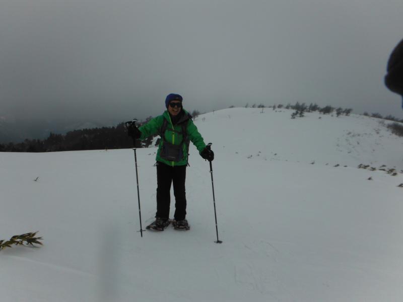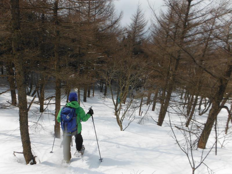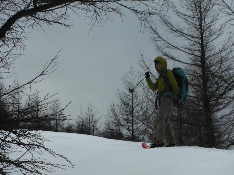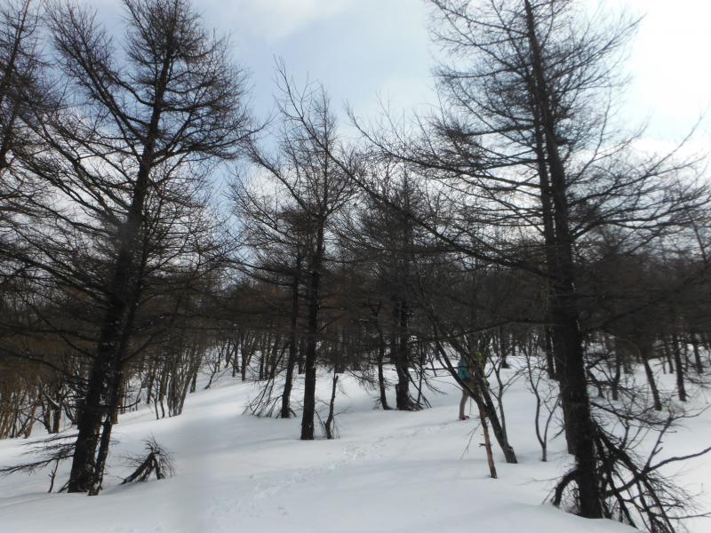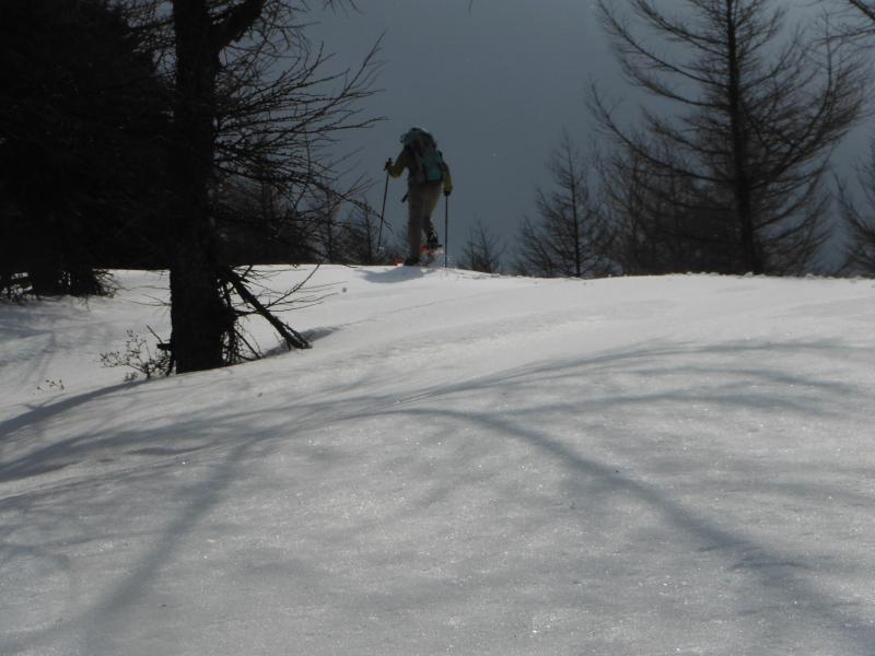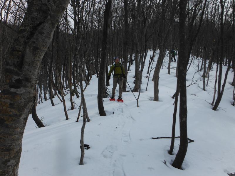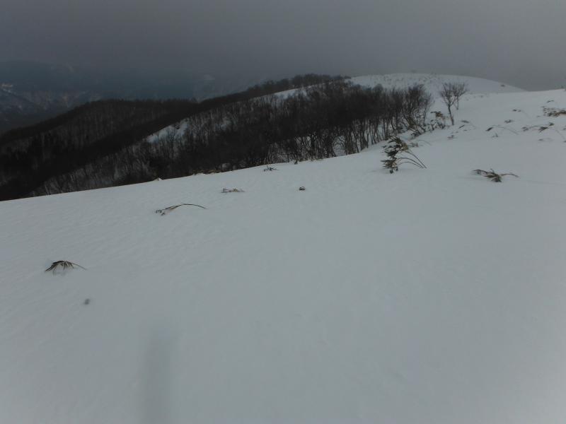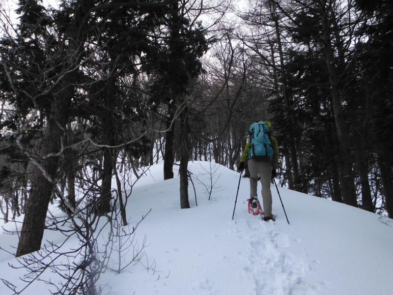 登山道は樹林帯の中を歩きますが、やや急な斜面が続き、歩き慣れていない方だとちょっと大変かもしれません。ようやく上部にでると雪原が広がっていて、天気が良いと気持ちよさそう感じです。今回は風が強くかったので、山頂についてもさほど休憩することもなくすぐに下山を開始しました。ここからがちょっと歩くのに苦労しました。