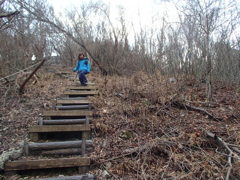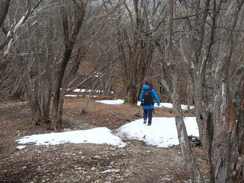 ・短く遅めの昼食タイムを摂り、下山開始です。もう山頂からはちょっと下るだけなので気分が楽です。未だに残る名残の雪を踏みしめつつ下っていくと木段が出てきます。この長くて急な木段を下り切るとおおたわの駐車場です(結構あっけ無く着きます・・・)。辻様、大変ご迷惑をかけていまい申し訳ありませんでした~!!