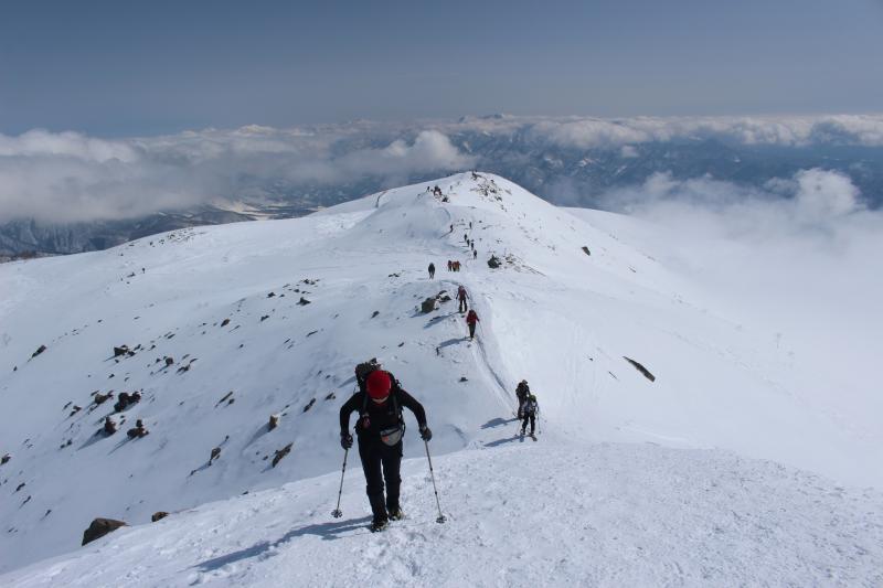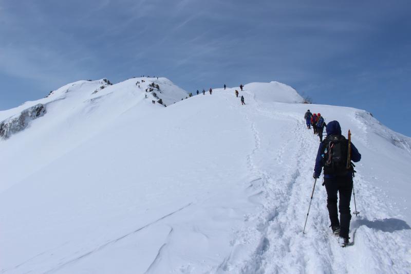 - 土曜日という事もあり、沢山の方が登られていて、スノーシュー、ワカンは必要ありませんでした。八方池山荘から皆さんアイゼンを装着し登られていました。
