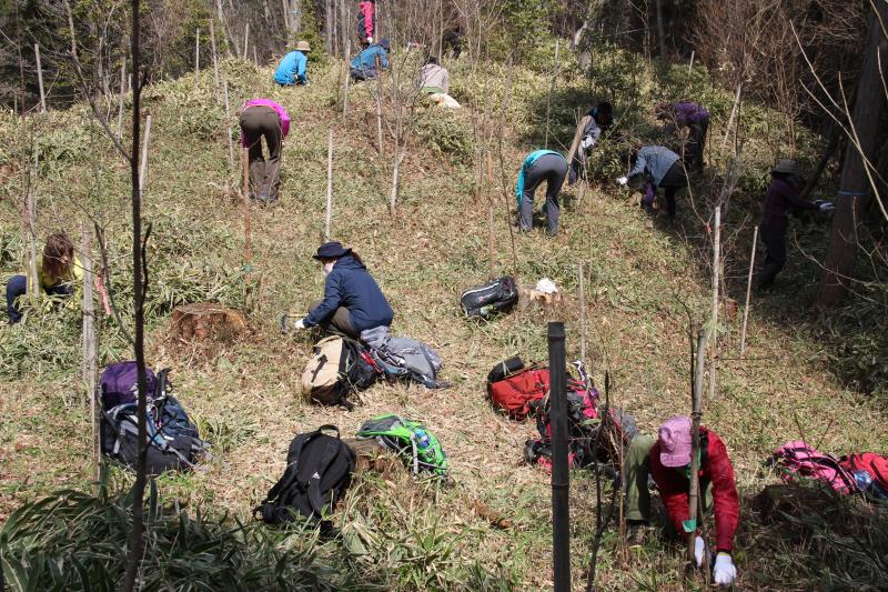 「山まゆの森」は植樹した苗木がうまく育つよう、まわりに生えて日当たりを悪くするミヤコザサや雑草を刈り取りました。