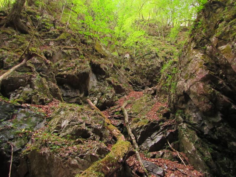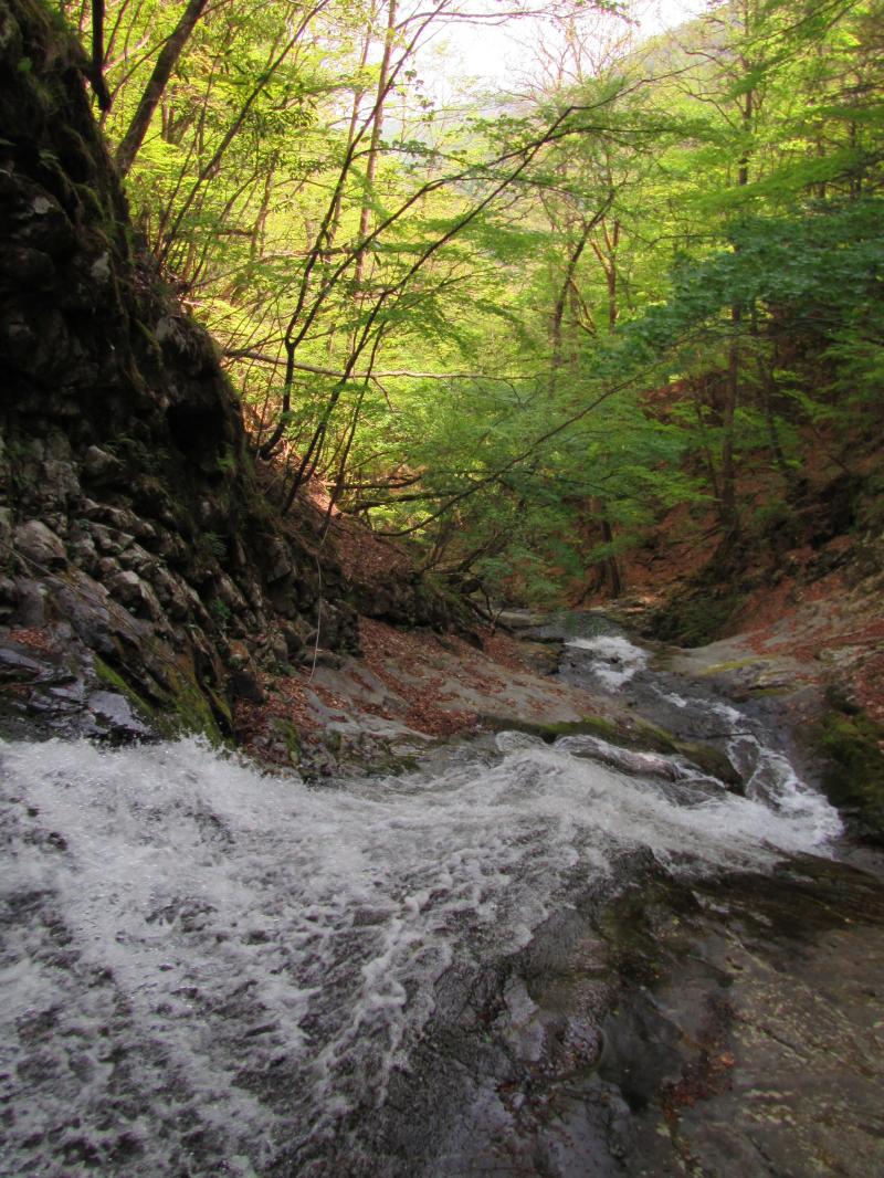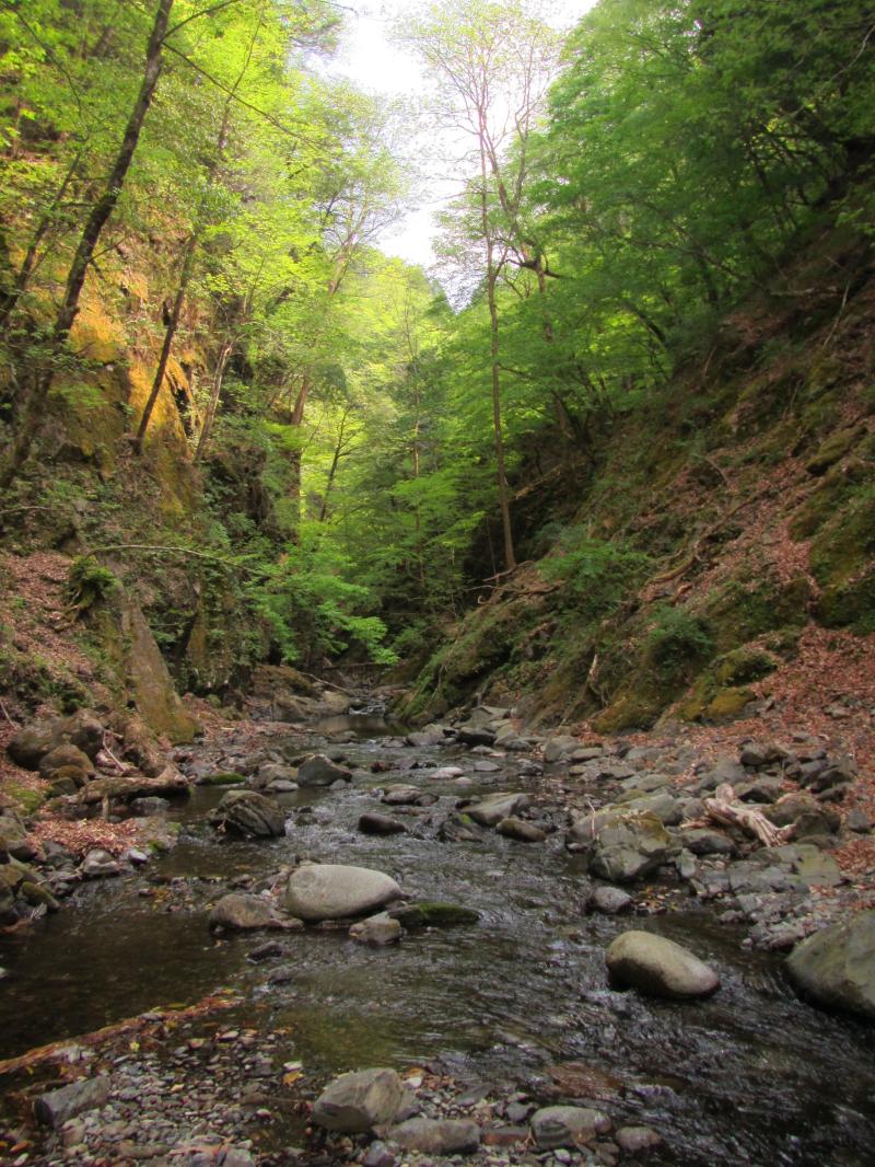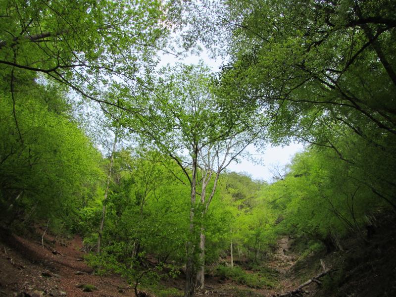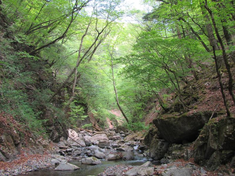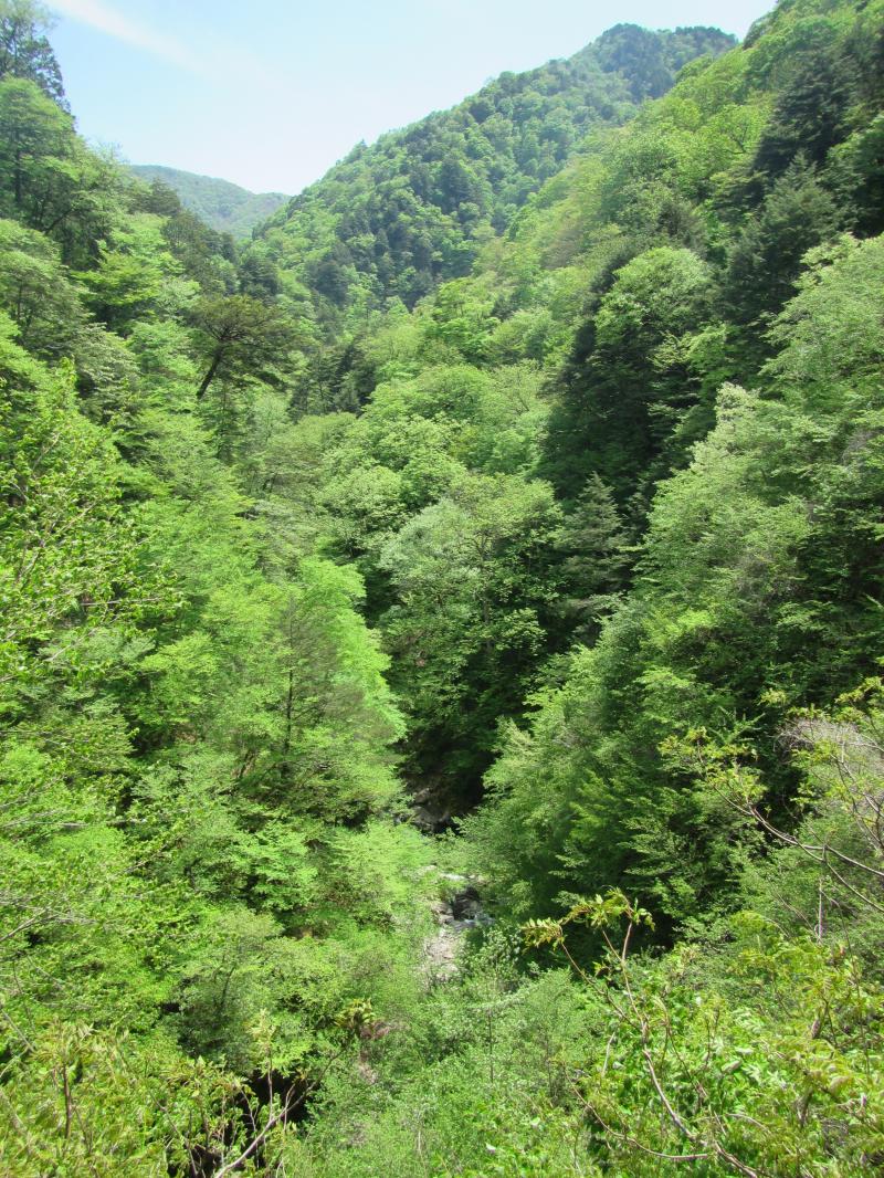 泉水横手山林道に入ると、泉水谷の深い険谷を覆い尽くす新緑に目を奪われます。