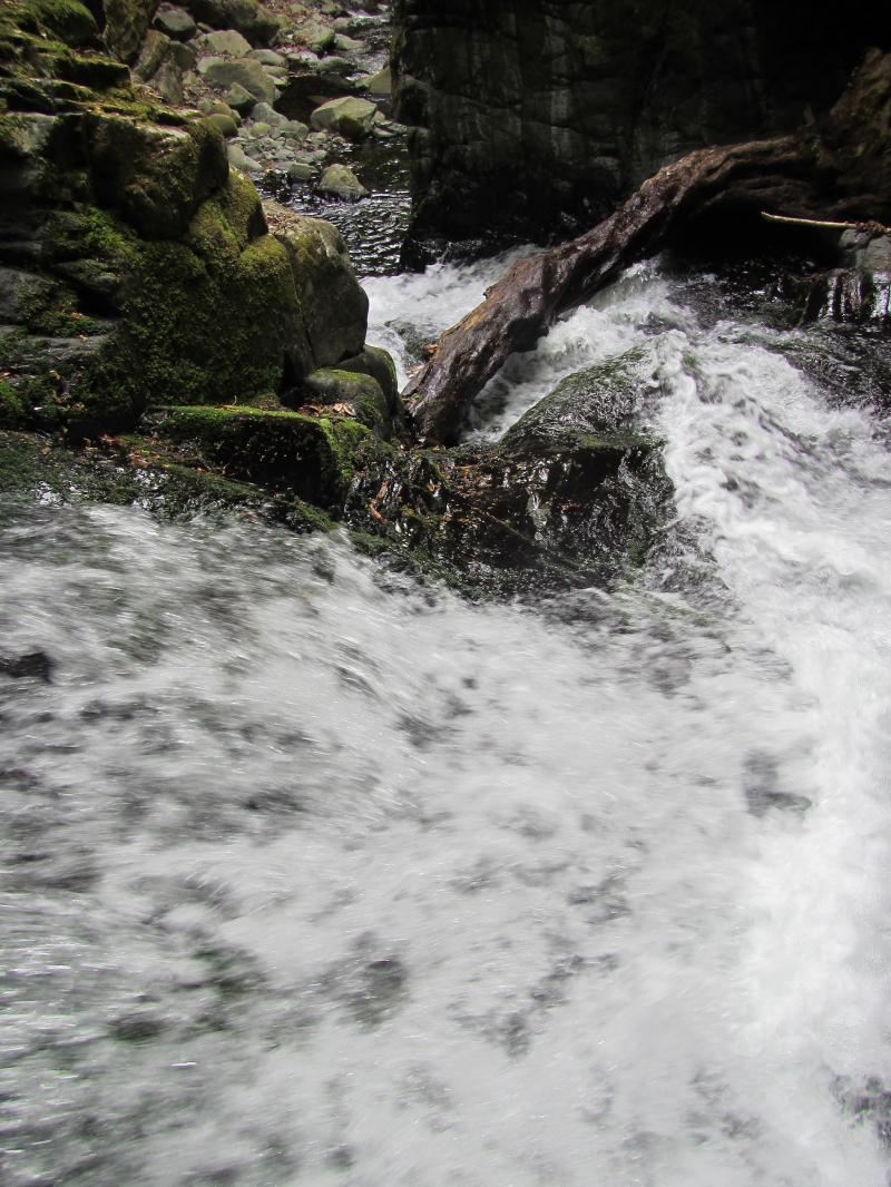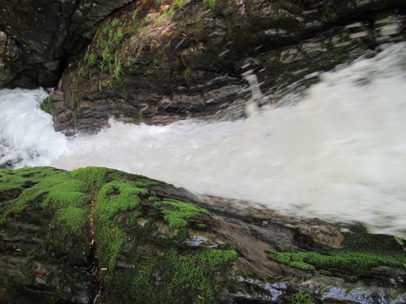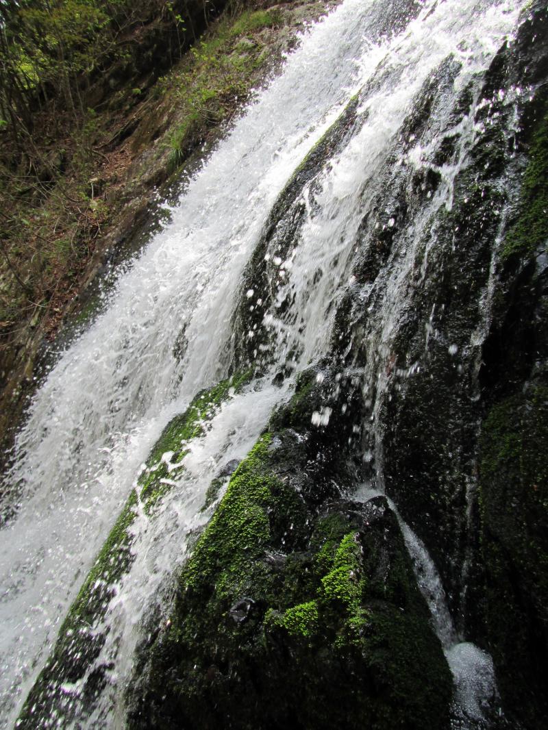 美しい苔の階段を踏みしめつつ、慎重に体重移動していきますが、激流の中で足を踏ん張らなければなりません。