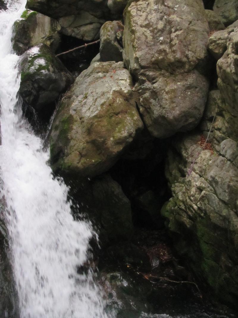 高巻く場合は右岸から小さく。5mほどの懸垂下降が必要だそうです。
