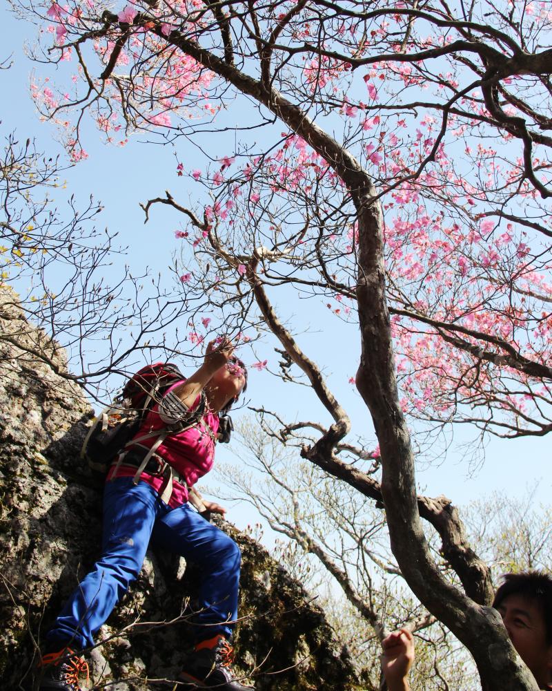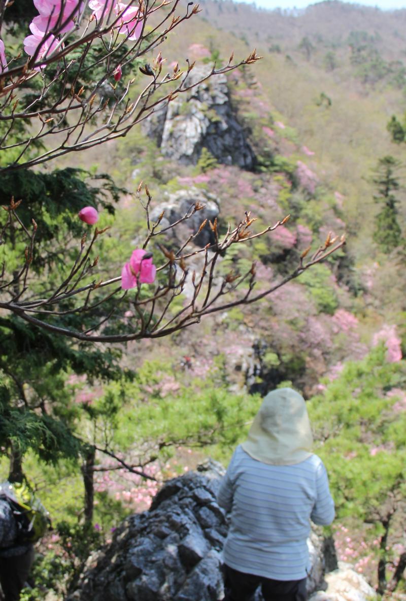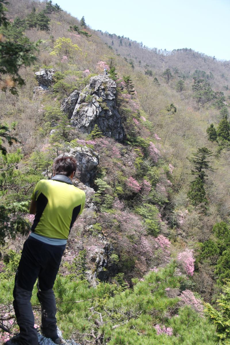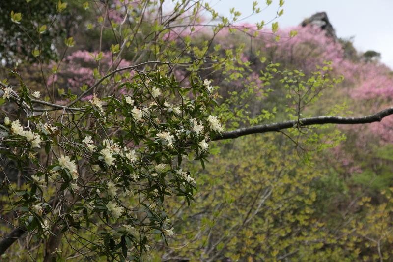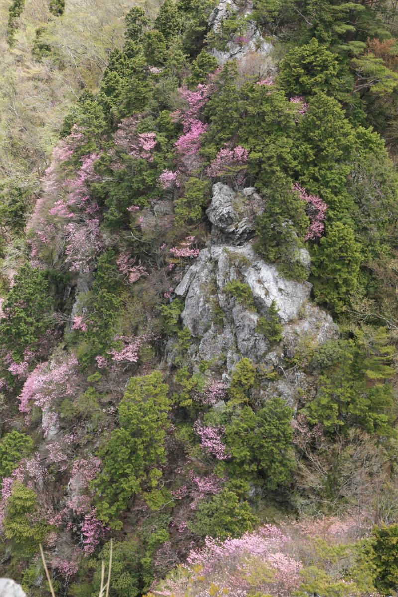 岩場に咲くアケボノツツジ、谷をはさんで、西からと東から 岩場がピンク色に染まる風景を眺めることができます。