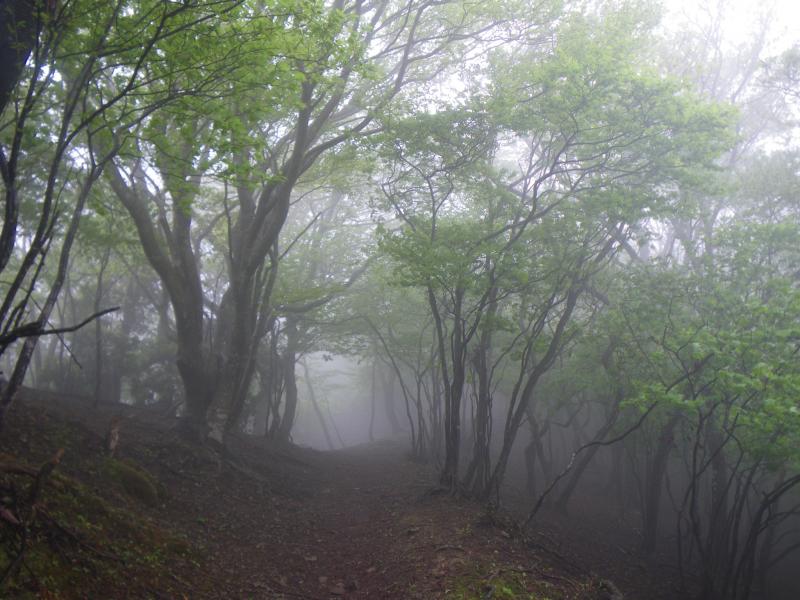 霊仙山といえばおすすめコースは展望抜群の西南稜ですが、今回は山芍薬を求めて、柏原道→榑ヶ畑道を歩いてきました。柏原道は駅からアクセスできるコースで、9.5kmと長い道のりですが、全般的にゆるやかな尾根道です。今日は雨は止んだものの、ずっとガスが立ち込め、せっかくの展望は得られずじまい。しかし、ややガスった新緑も神秘的ですね。柏原道で見られる山芍薬はまだ硬そうな蕾でしたが、かなりの群生です。