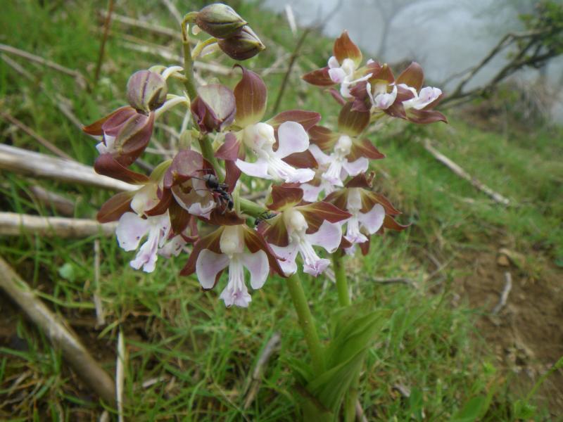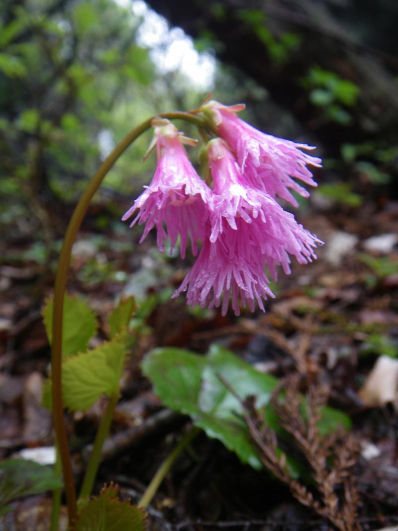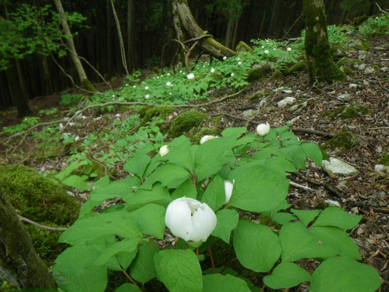 カルスト高原が広がる山頂部は今日はどこを歩いているか全くわからないほどのガスで、下を向いて、踏み跡をたどるしかない状況。経塚山手前にある避難小屋も突然、視界に現れ、またイチリンソウが咲いているのに、風が強すぎて写真にも収まらないという一日でした。下りに使った榑ヶ畑道ではようやくガスも晴れ、新緑がすばらしい状態でした。榑ヶ畑道の山芍薬は見頃から咲きかけの蕾まで様々、正直こんなに群生しているとはびっくりでした。エビネも途中で見つけることが出来、今日の目的は達成しました。