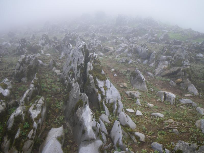 ⑪米原避難小屋手前からカルスト地形になり、小さな石灰岩が無数にあり、その間を登山道が走り、イチリンソウが広がります