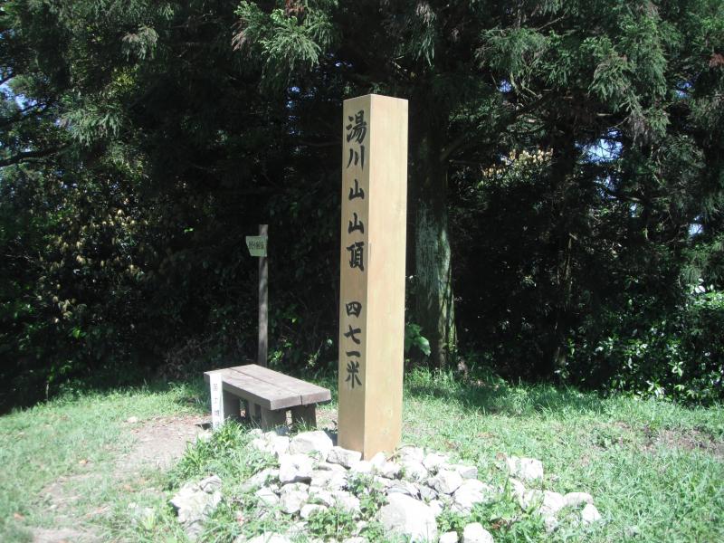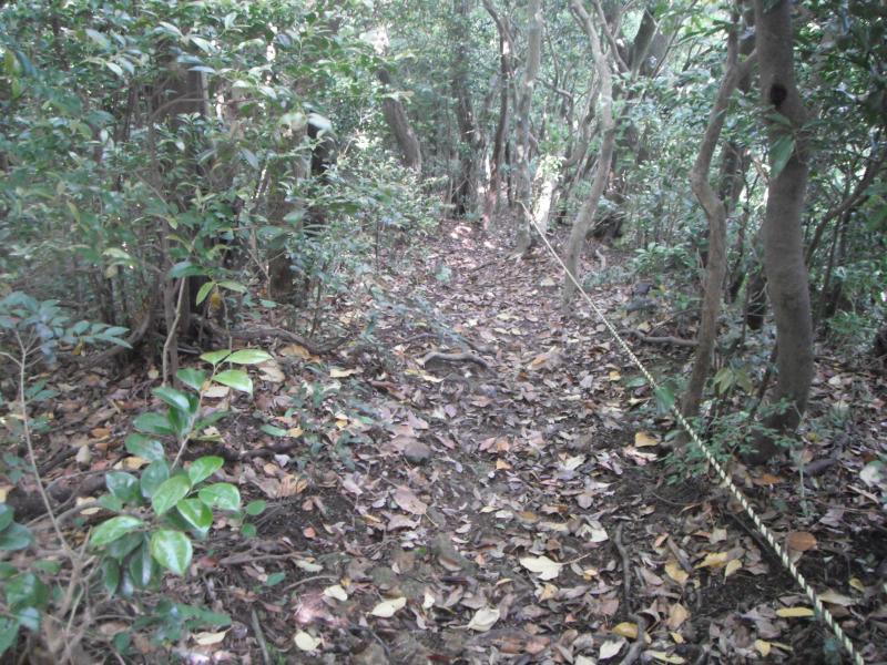 垂水峠まで急坂を下れば最後の山、湯川山への登りです。これが急でした!そして滑る!ロープにつかまりなんとかこなし、「湯川山まで0.3km」の標識を見たときには救われた思いでした。やっとこたどり着いた湯川山からは玄界灘の大島が春霞の中に見え、空気が澄んでいれば神の島、隠岐の島まで見えるそうです。この山が一番眺望が良かったですね。