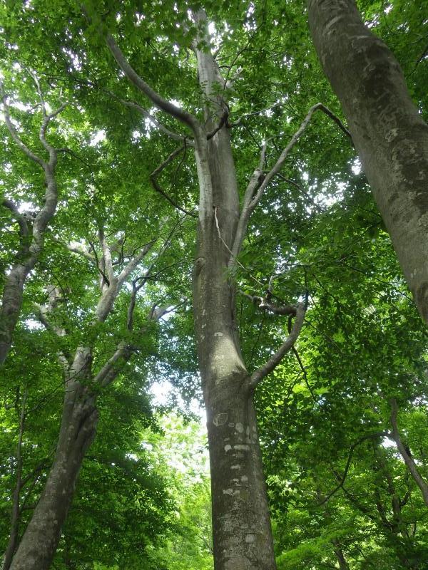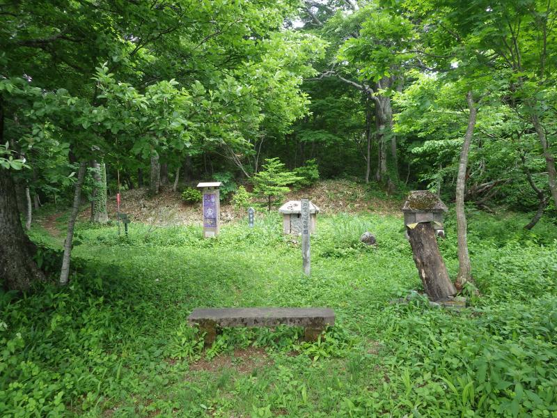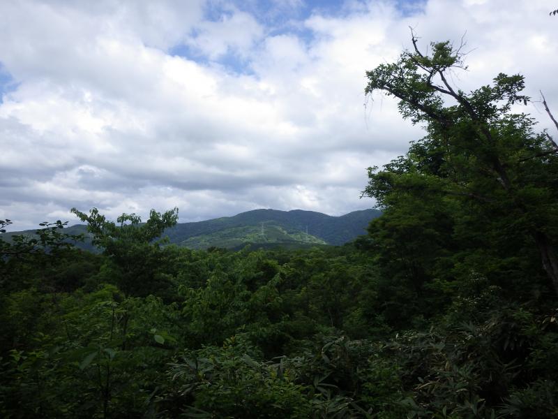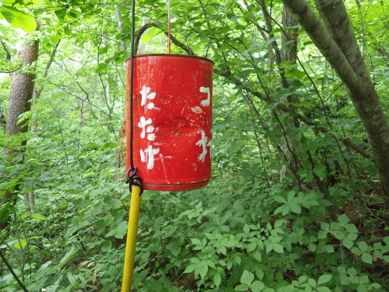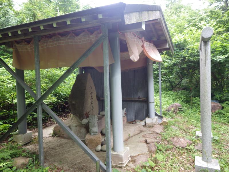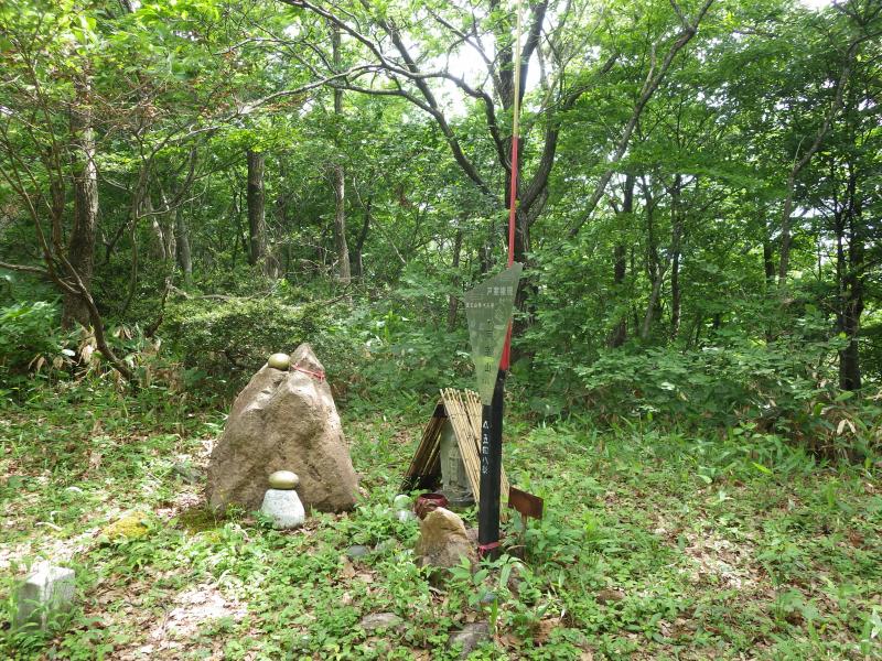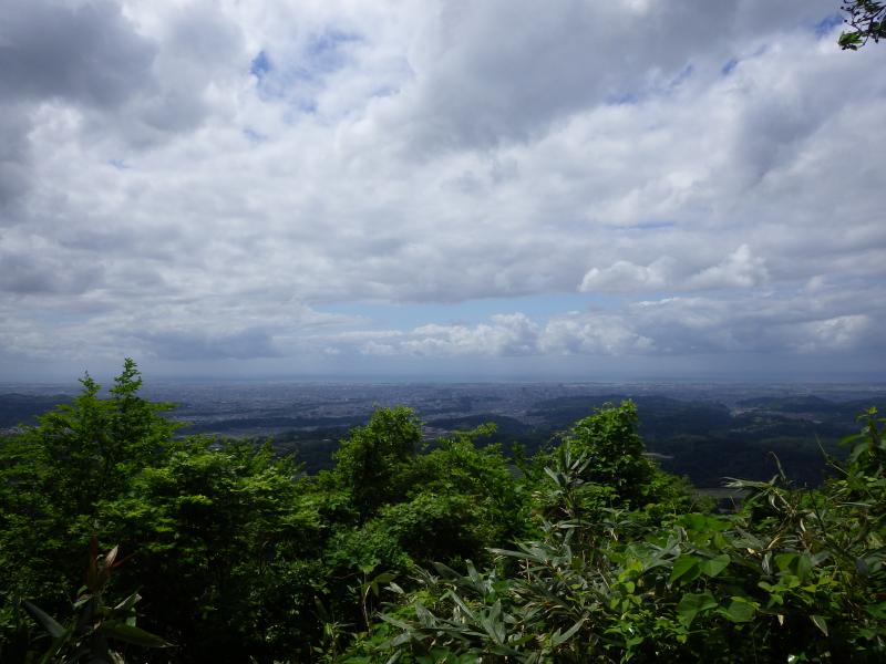 新緑の季節だからか登山道は鬱蒼とした感じでやや細い。しかしふと立ち止まって上を見上げれば新緑の緑と日差しでとても綺麗。あまり人が歩いていないのか今日は雲の巣との戦いであった。さらに!所々熊対策のために空き缶と棒が吊るされていて【たたけ!】と。まじか?でるのか?ありがたく鳴らす。程よく汗が出る感じの緩やかな登りの後、平坦な道が始まると次々と祠が現れる。九頭竜権現、戸室権現。一番奥の祠の前は開けていて金沢市街が一望できた。そこからすぐに山頂に着くが展望はない。一服するならここで。