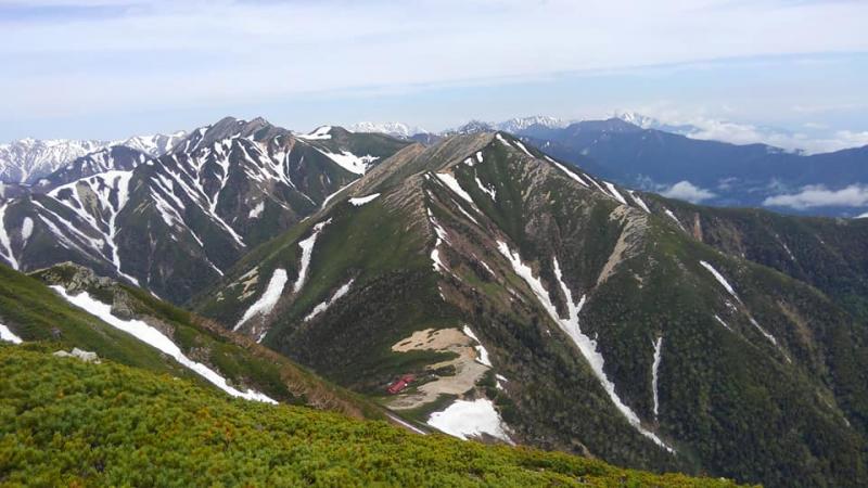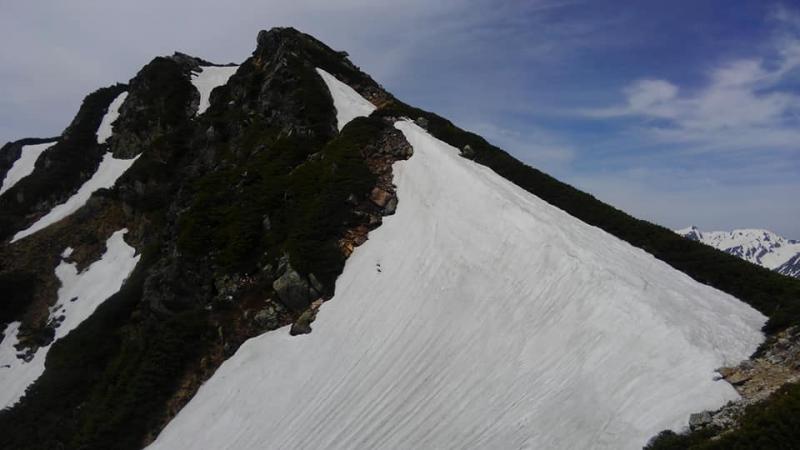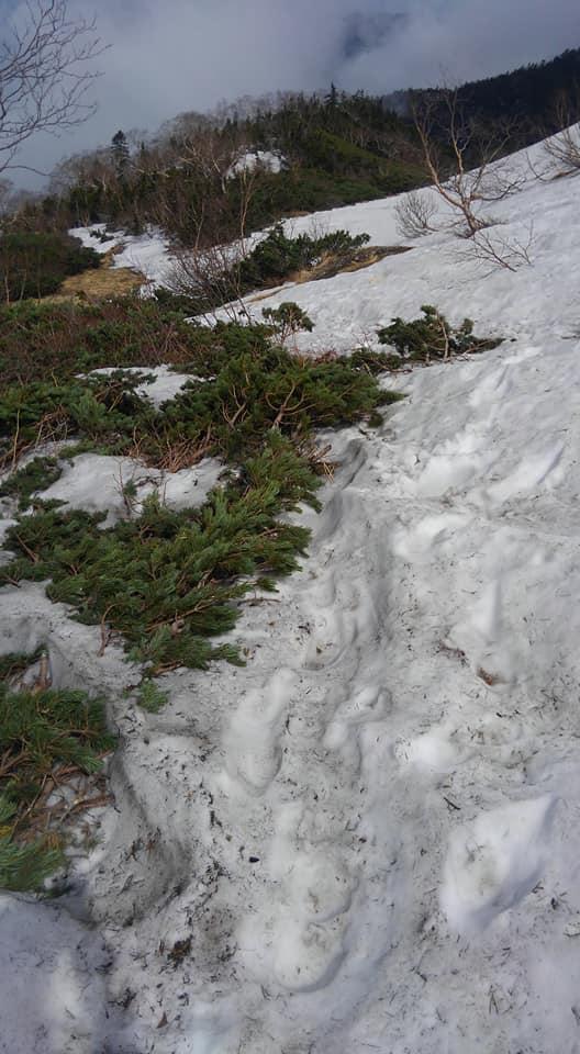 蝶ケ岳~三俣:山頂直下からの残雪ありぐずぐずでよくないです。雪の下も滑りますキックステップまたは10本爪以上のアイゼンがあったほうがいいかもと。1日ごとに変わる季節です、蝶ケ岳ヒュッテに確認しましょう。