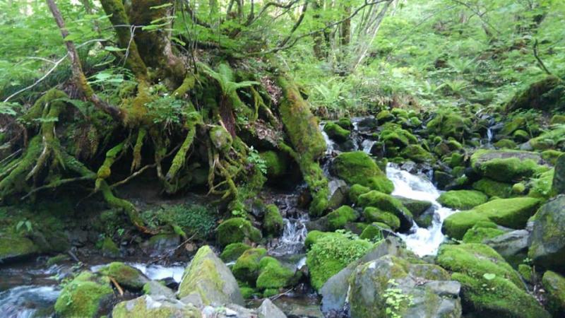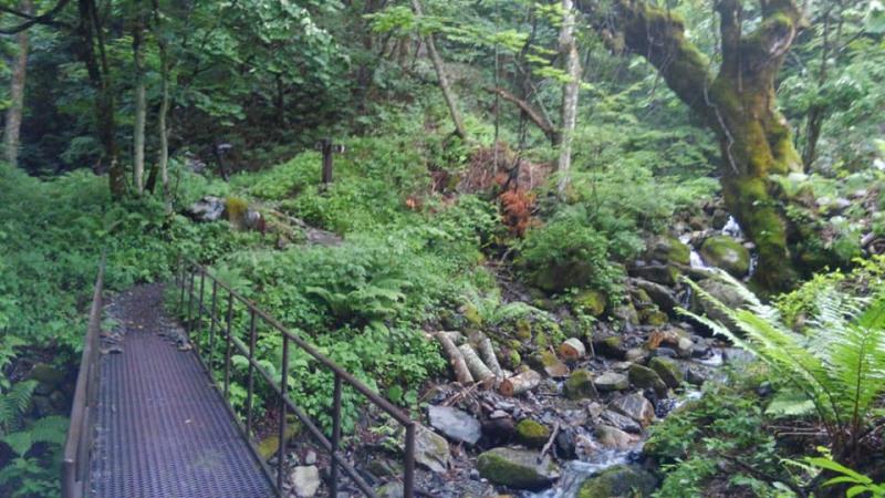 登山口付近は濃い緑の癒しの森で水もおいしいです。