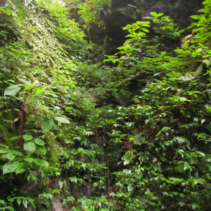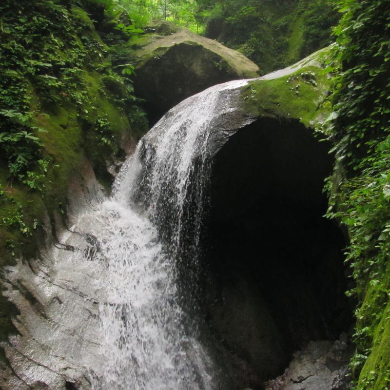 そしてその上流部に眼を向けてみると、原生林が描く豊かな濃緑の壁のなかに際立つ白線が、異質の空間を作り出しています。