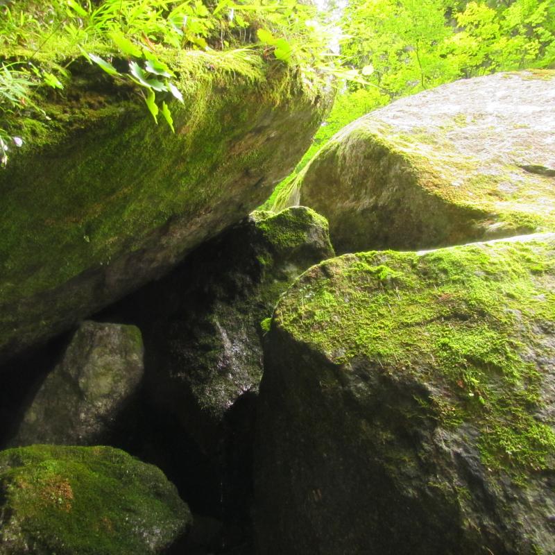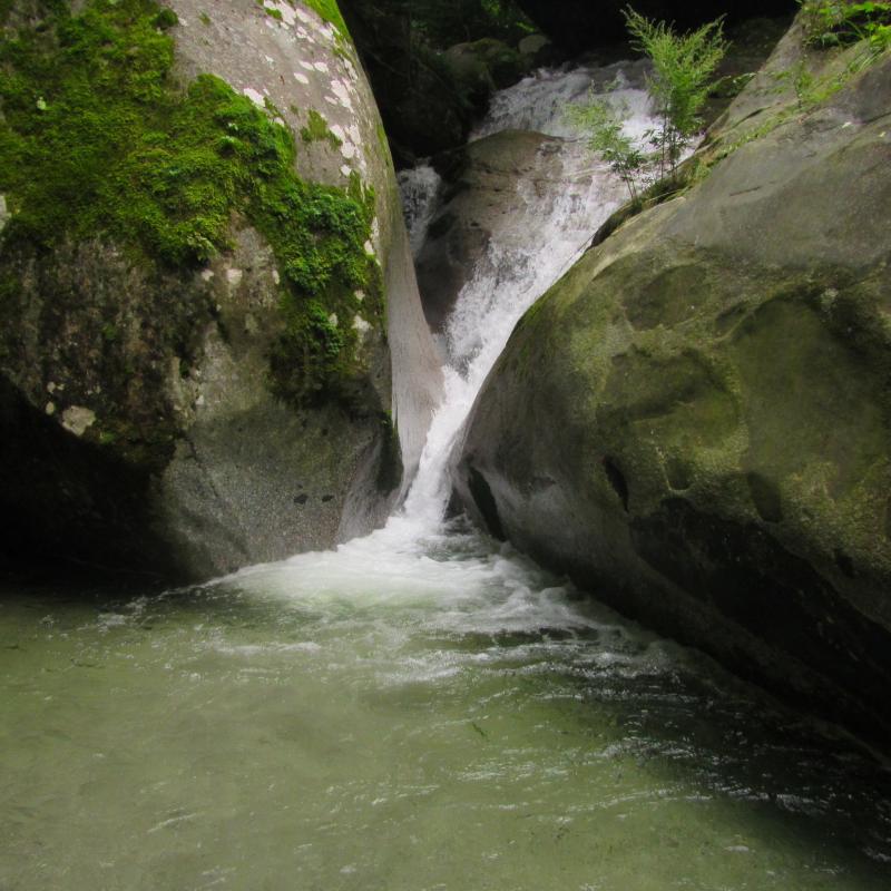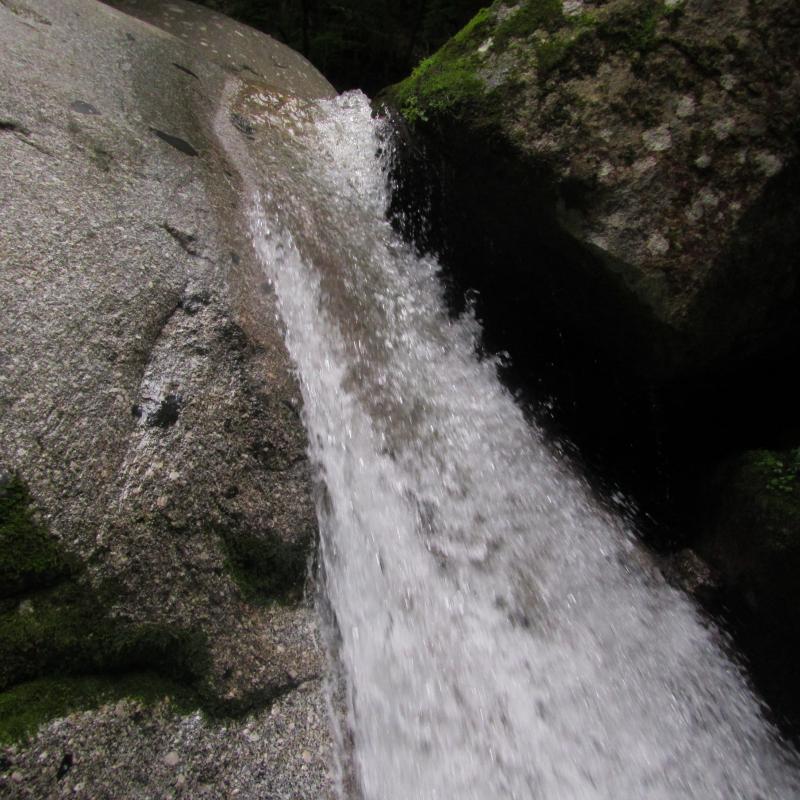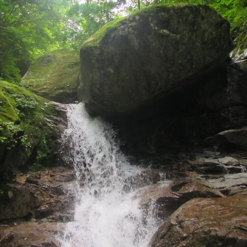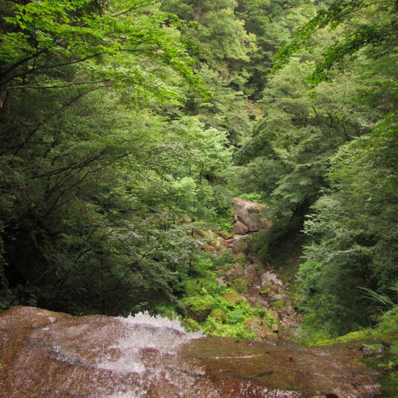 本流にかかる滝を左から巻き上がると、大岩のなかナメ床が広がります。