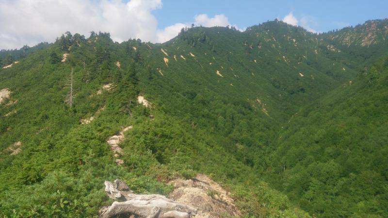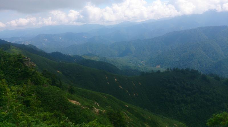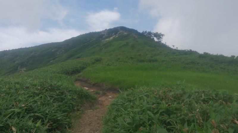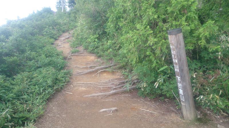 登り出した時間には既に太陽が昇っており、下台倉山まで背中に直射日光を浴びながらの急登に息も絶え絶え、僅かな木陰でしばらくぐったりしてしまいました。今日は下台倉山までかな。せっかくここまで来たのに帰るのか。ぼーっと考えていると尾瀬の燧が雲間から顔を出していました。それを見て少し元気になり再び歩き出しました。