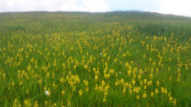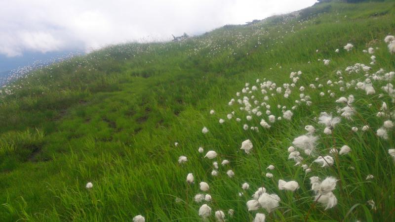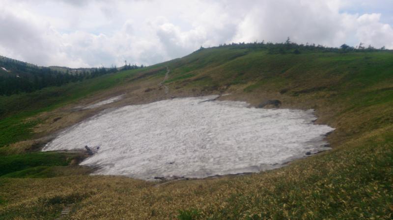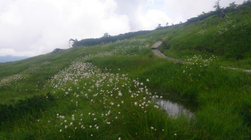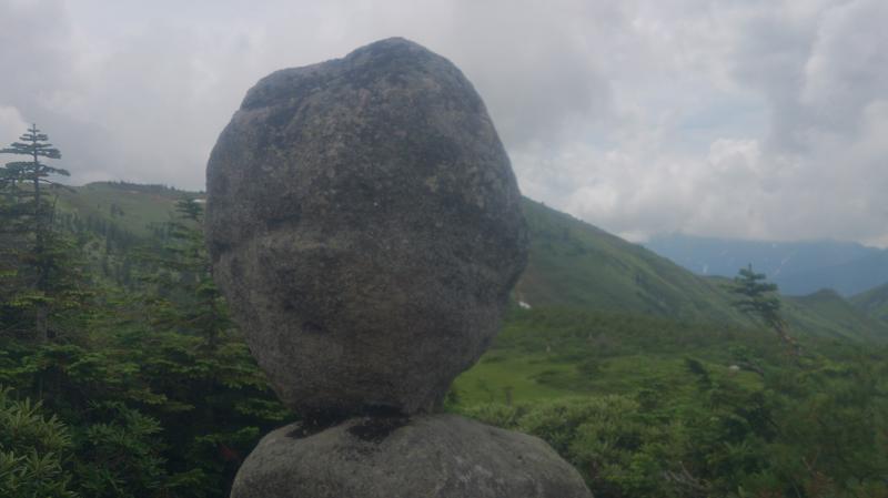 どこまでも続く広い台地に一面のお花畑、池塘に映る夏雲・・・見たかった景色がやっと見れました。ゆっくりのんびりしたい気持ちを抑えとりあえず頂上へ。頂上は進路を南へ、ワタスゲが静かに揺れるメルヘンな道を登り切った先にあります。その後は来た道を少し戻り、水場を経由して奇岩・玉子石を目指します。この水場は雪渓が溶けて小川になっており、ほとりにはコバイケイソウやハクサンコザクラが咲いていました。雪渓を渡って木道をさらに登って下ってあと200mの看板。遠くから見えるのかと思っていましたが、近くまで行かないと姿を拝めないとは心を掻き立てられます。最後の登りを終えるといきなりどーんと玉子が鎮座していました。おぉー結構大きい。風化が激しいので触らないでくださいとのお触書も。こんな貴重な絶景なのに良いカメラを忘れたのが本当に悔やまれる・・・。