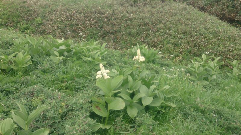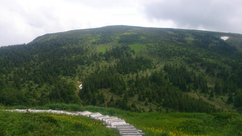 下台倉山に着いてからは、台倉山まで西側の樹林帯と東側の細い稜線を交互に行き来しながら歩きます。十数回出たり入ったりを繰り返し台倉山の三角点を過ぎると今度は延々と森の中。途中から木道に変わり細かいアップダウンを繰り返しながらひたすら歩きます。植生が杉、ダケカンバ、シラビソと変わって行ったので、眺望が無い中でも標高が上がっているのは感じ取れました。再び傾斜がきつくなったころ、辺りの視界が開け遥か遠くに奥只見湖を確認。さらに急な岩場を一登りすると、そこは楽園でした。