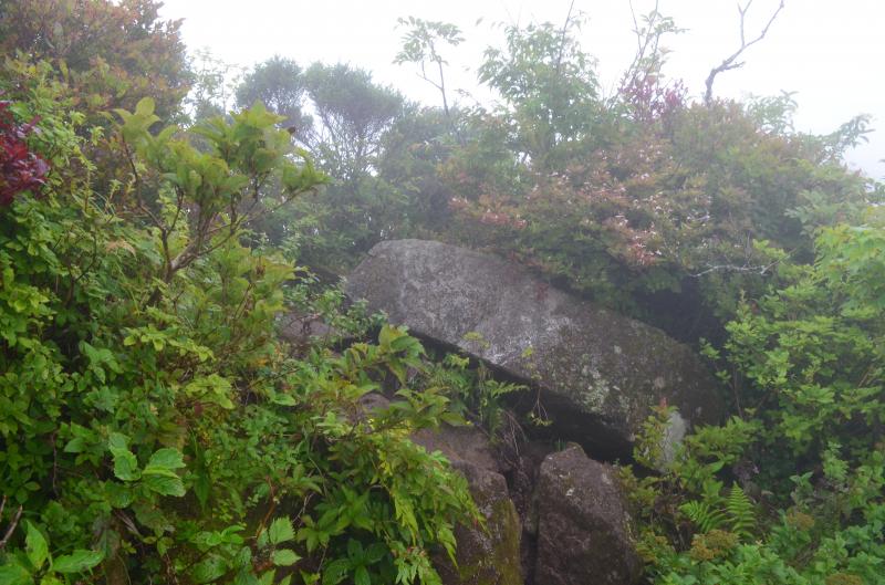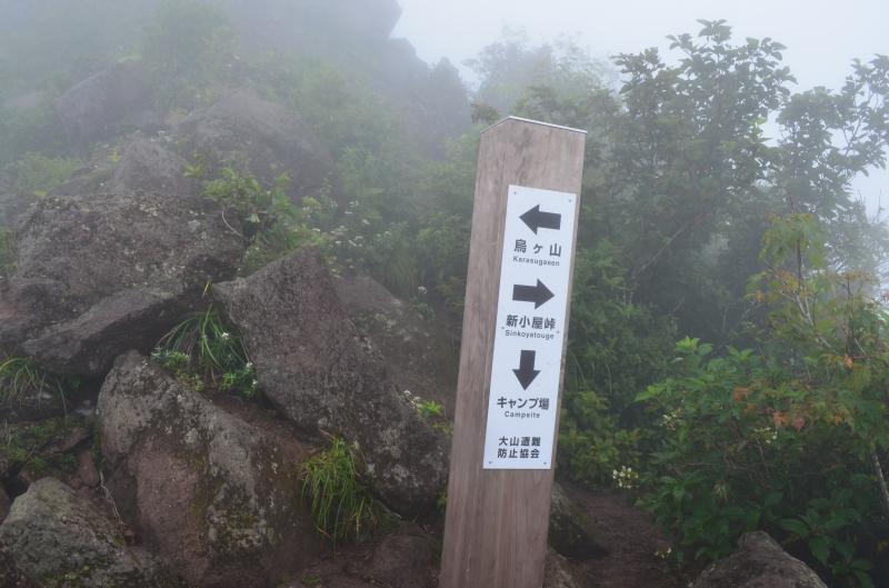 なかなかハードな登りで山頂に着いたのですが、あいにく小雨模様でガスがかかっており、大山南壁の雄大な姿を見ることができませんでした。残念。