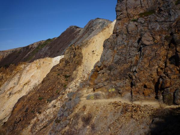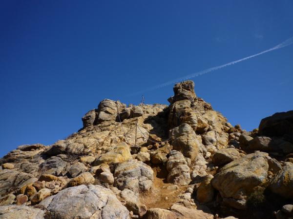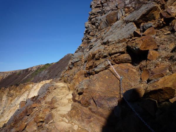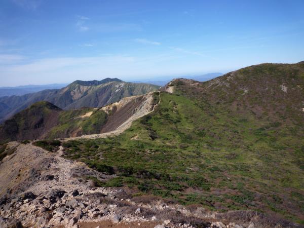 やはりガレ場、岩場の連続ですが、茶臼岳周辺のような火山特有の“無味乾燥”な風景ではなく、アルプスチックな景観です。また、朝日岳手前はやや高度感のある鎖場あり。雨で滑りやすくなっている日は特にご注意を。