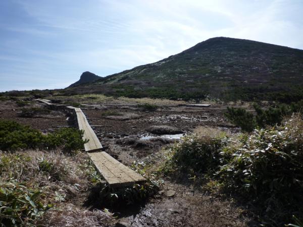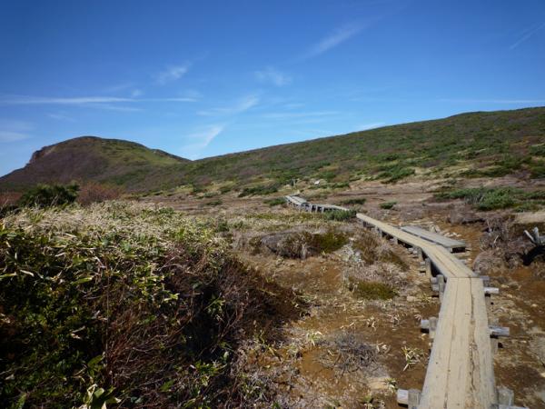様相は一変します!清水平は木道も敷かれたたおやかな湿原。三本槍岳はなだらかだが、この山域の最高峰。また福島県との県境です。清水平周辺の道はぬかるんでいます。「ツルリッ!」にご注意。