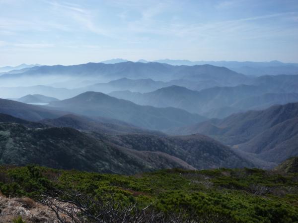 - 那須ロープウェイ山頂駅(9:50)→茶臼岳(10:15)→朝日岳(11:10)→清水平(11:35)→三本槍岳(12:00,休憩30分)→峰の茶屋跡避難小屋(13:45,昼食休憩30分)→牛ヶ首(14:30)→那須ロープウェイ山頂駅(14:50) 行動時間:約4時間