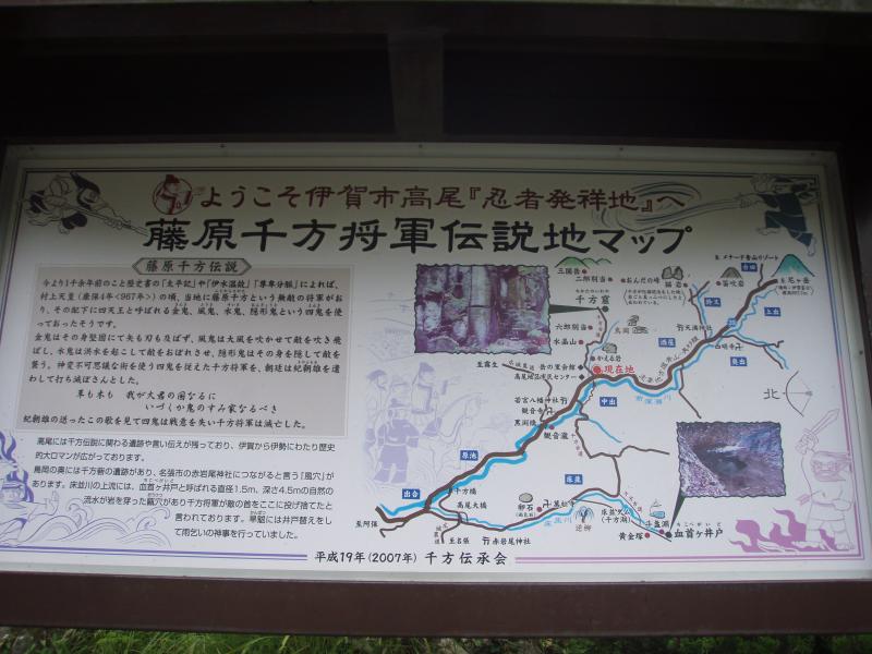 「太平記」巻十六「日本朝敵の事」によると、天智天皇の時代(7世紀頃)朝廷に反乱を起こした藤原千方は神変不可思議な術を使う「金鬼」「風鬼」「水鬼」「隠形鬼」と呼ばれる四鬼を従えて戦い朝廷軍を悩ましたそうで、千方窟はその時の城砦跡と言われており、不思議な戦い方をした四鬼たちは、後の時代の忍者の原型になったのだと伊賀地方に伝わっています…。