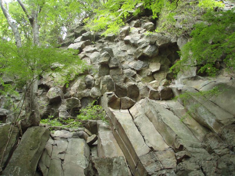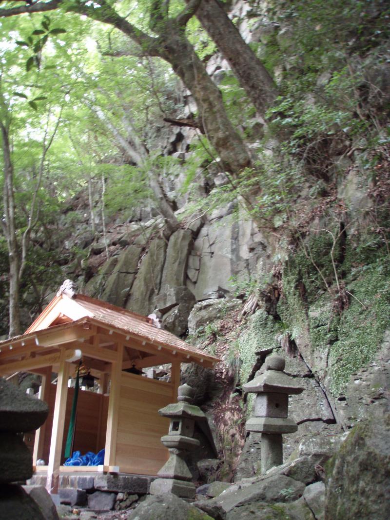 「東門跡」から杉木立の中を進んで行くと、柱状節理の結構巨大な石柱が屏風のように並んでいる「千方明神」の窟前に到着。千方城は自然を巧みに利用した城砦だったのが分かります。四鬼が姿を消したという「風穴」は、名張にある赤岩尾神社に地下で繋がっていると伝えられ、千方城の非常用脱出口だったともいいます。