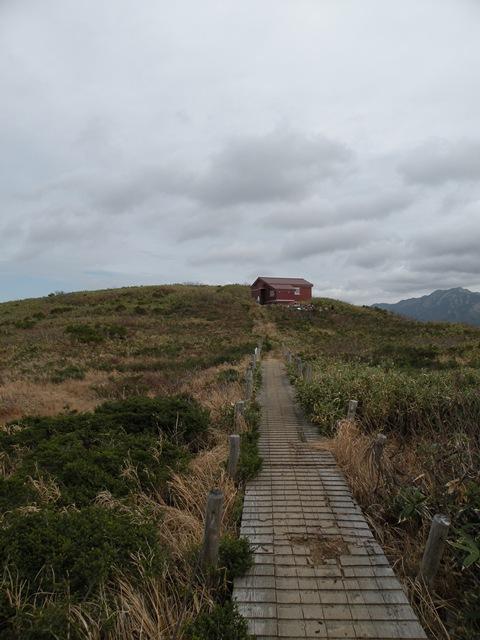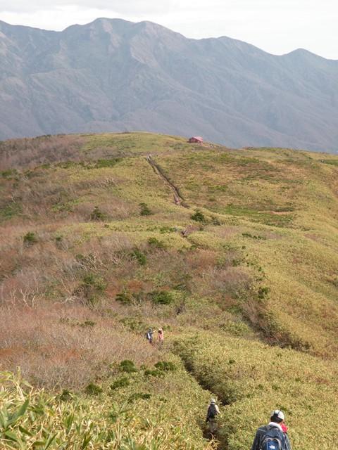 山頂から避難小屋へ向かう道は、最高でした。(^^♪ 草原になっていて、広く視界があり、いろんな山々を望むことが出来ます。 登った甲斐がありましたね。みなさん♪