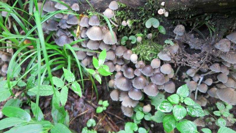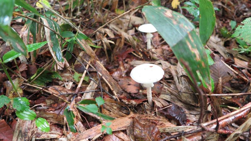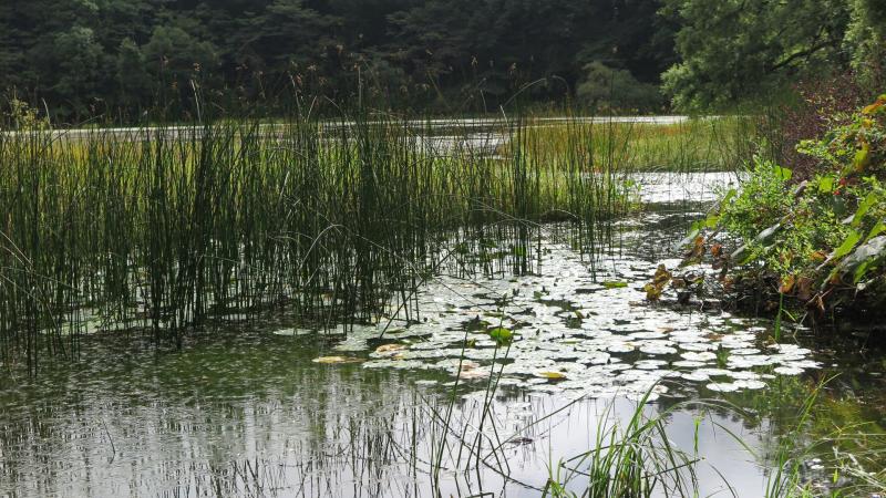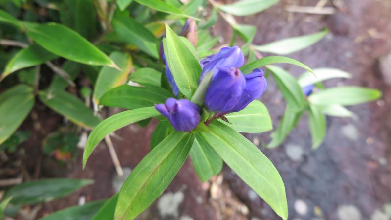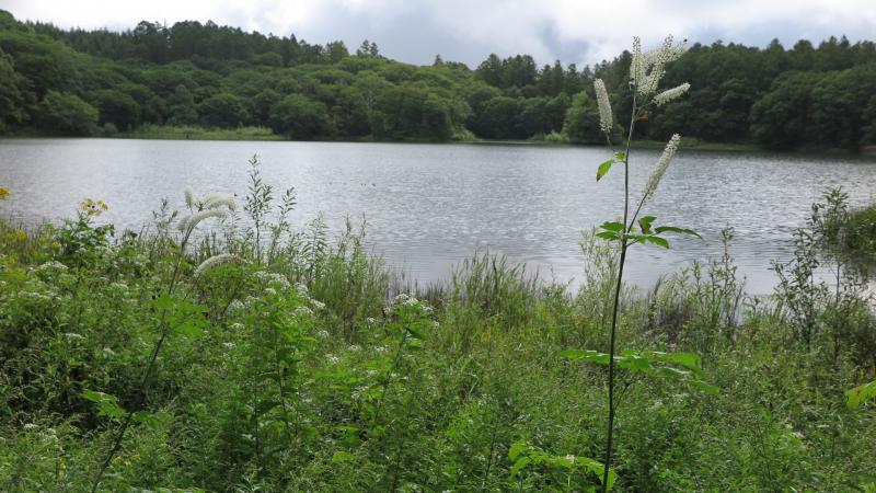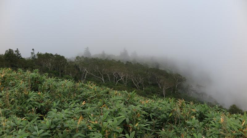スタートしてすぐに種池、古池の見所があります。ここを過ぎると延々と樹林帯歩き。雨は降らねど一帯を覆っていた厚い雲はなかなか取れず、シラタマノキが群生するしらたま平までほぼガスの中の登りとなりました。こうなってくると自然に口数も減り、眠気との闘い、地味にきつい登りでじっとり不快指数も上昇。もう帰りたいと思いかけた頃にようやく稜線へ。ガスは取れませんが、道も平坦となり、この時期の代表的な花、オヤマリンドウ、ヤマハハコを眺めながら頂上を目指しました。