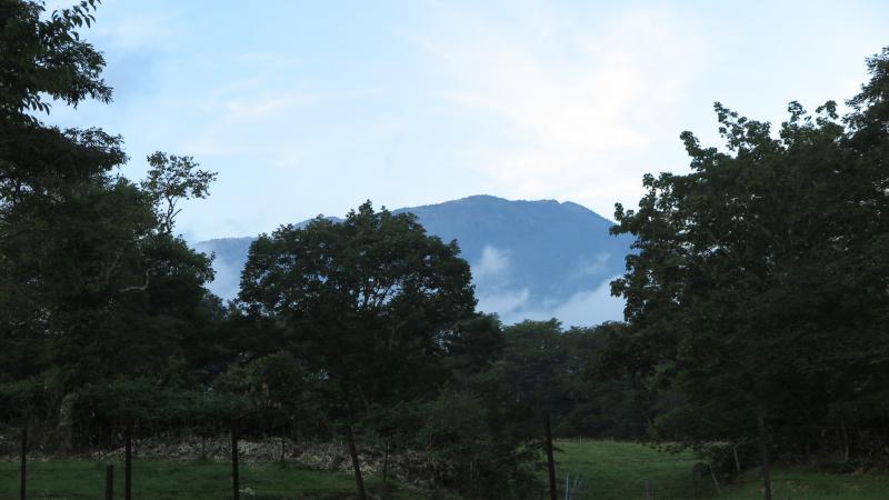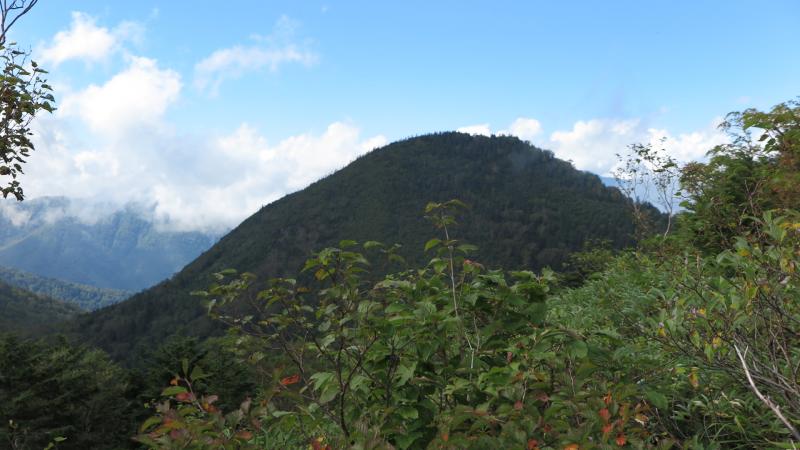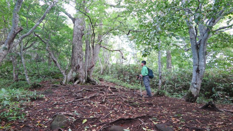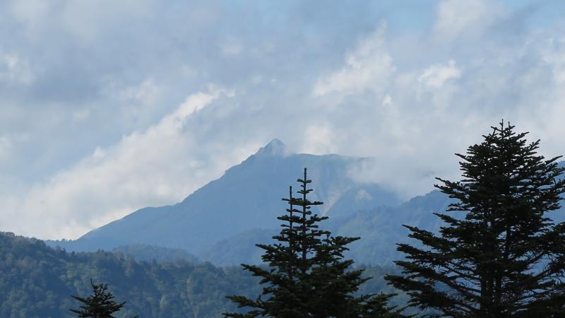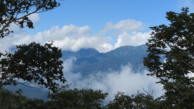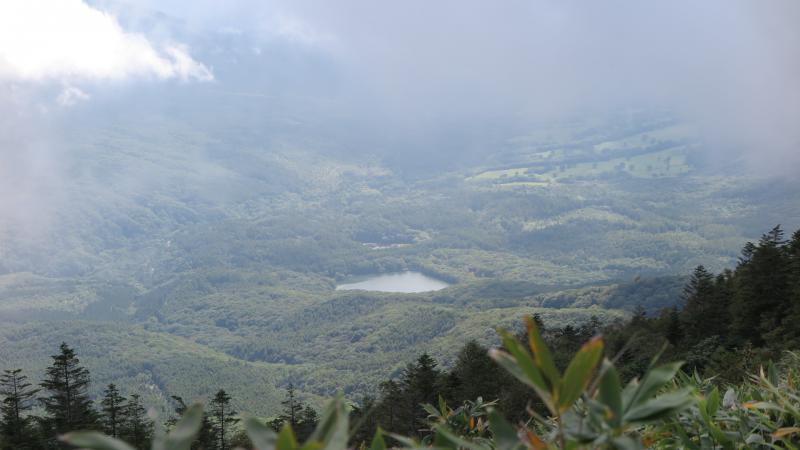 山頂に到着してしばらく休憩しているといつの間にか北側が晴れて、笹ヶ峰牧場からたおやかに聳える火打、焼山、さらには雨飾山が望めました。ここから見る雨飾は険峻、布団菱の岩肌が銀色に輝き、とってもイケメンな雰囲気、縦走欲を掻き立てられます。気が付くと眼下のガスもなくなり先程通った古池が静かに佇んでいました。あの辺までまた長い樹林帯を下りないといけないと思うと少し気が滅入りましたが、良い景色を見て皆元気になり、賑やかに山談議をしながら下ってきました。