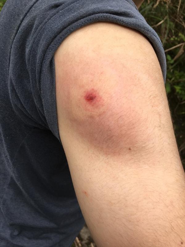 気づいた時には大塚くんは数匹のスズメバチに囲まれ、「降ろしてください!!」という大塚くんの怒号で私がロワーダウンを始めたものの、間に合わず右腕を1か所刺されてしまいました。