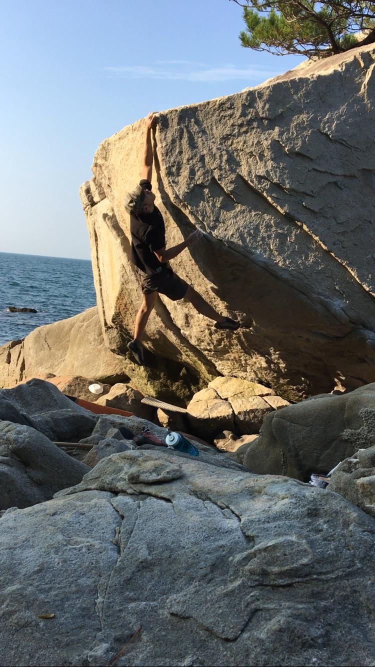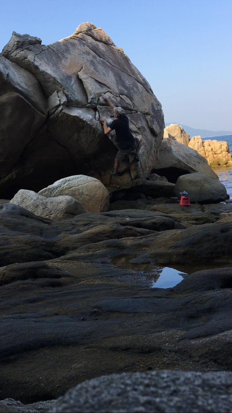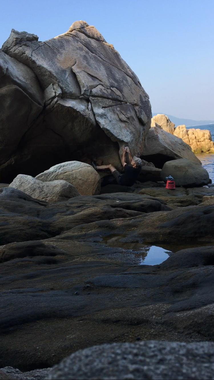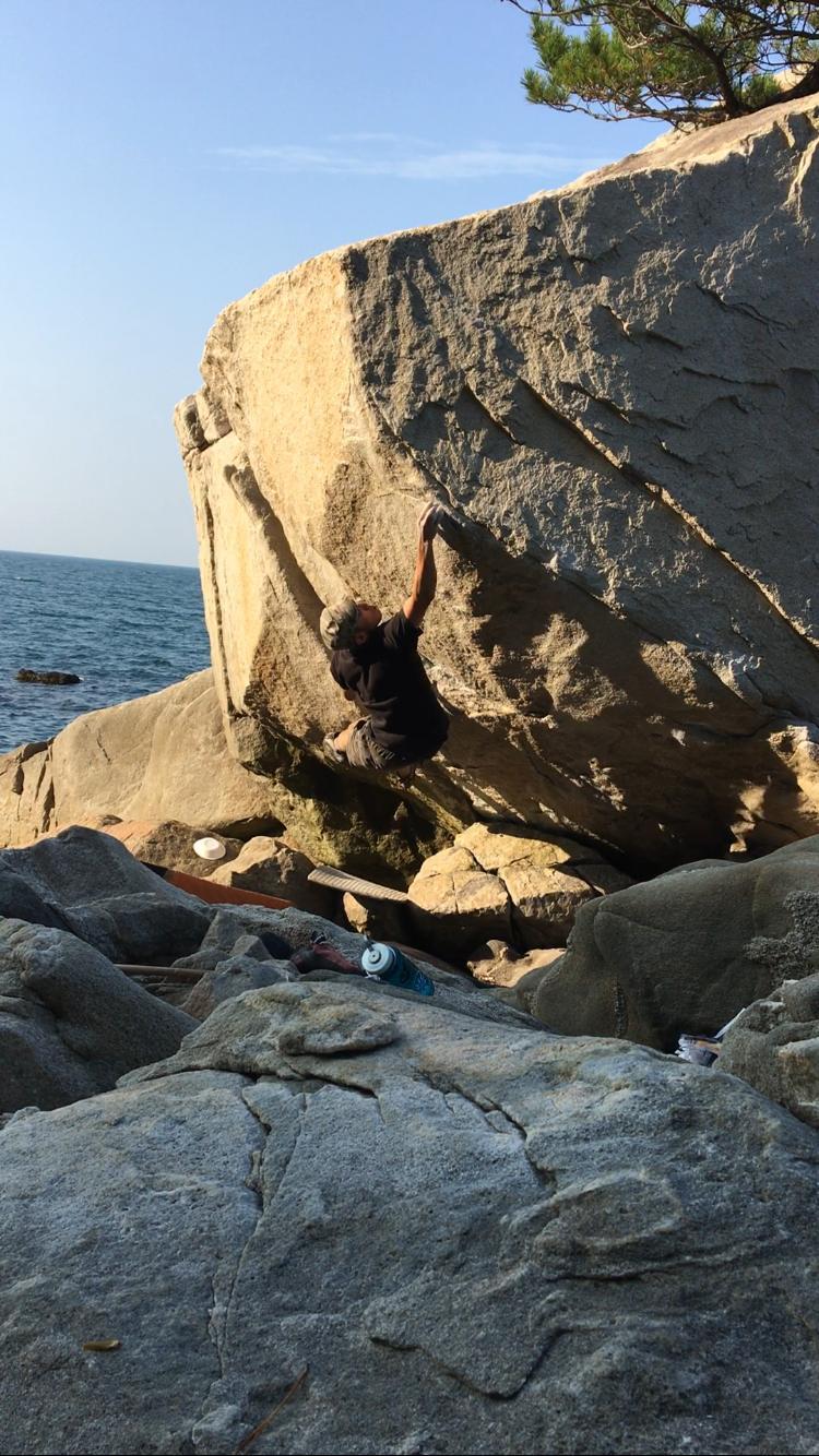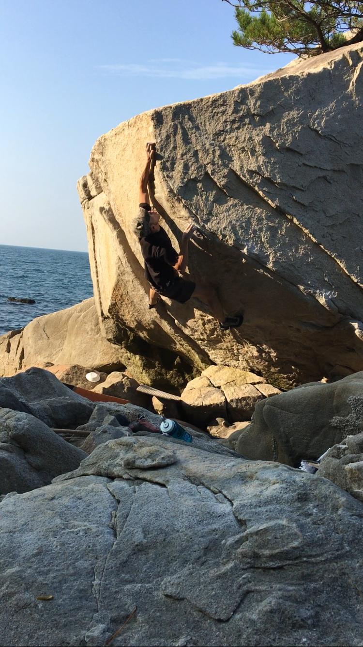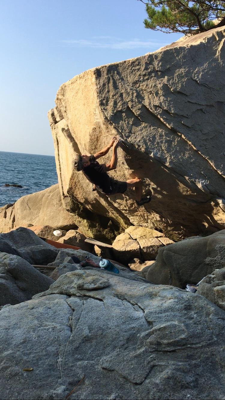 ②干潮時に岩の基部に取り付ける課題。スタートから真っ直ぐあがりました。