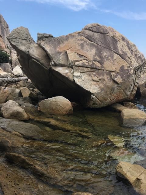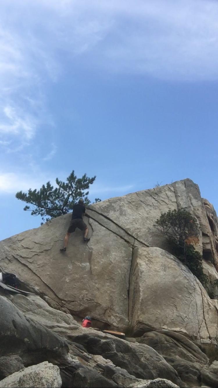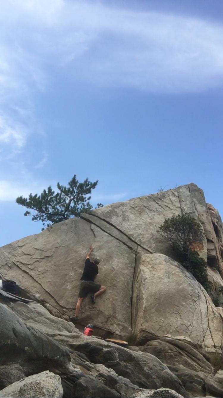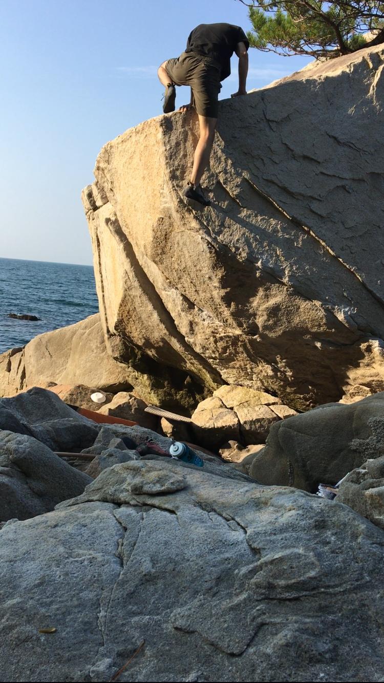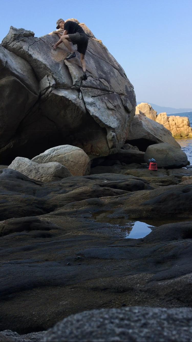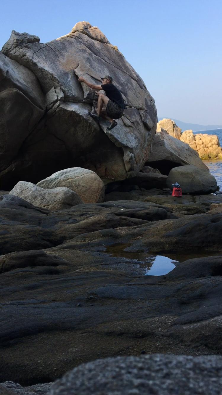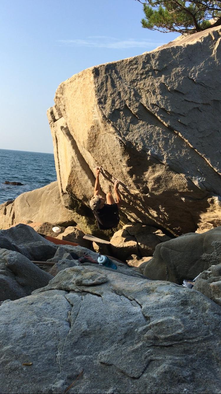 ②干潮時に岩の基部に取り付ける課題。スタートから真っ直ぐあがりました。