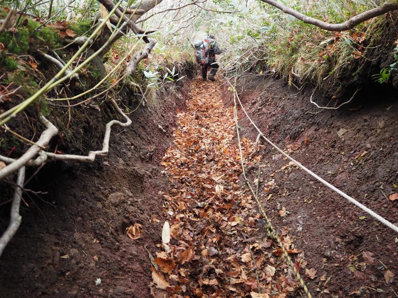 ・山頂直下は赤土をくり抜いた道で急でとても滑り易いです。ロープあり。