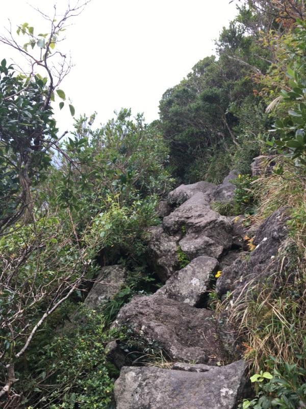 - 登山道の下地は泥、岩(火山岩)、木の根。全てが湿っている。そういう樹林帯をひたすら登る。おそらく晴天が1週間程度続かないと乾くことはないのではないか。