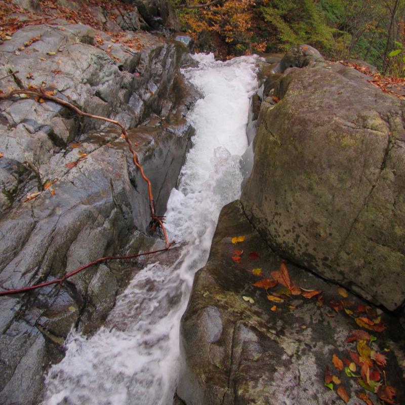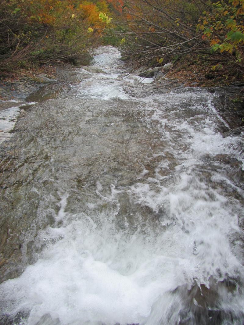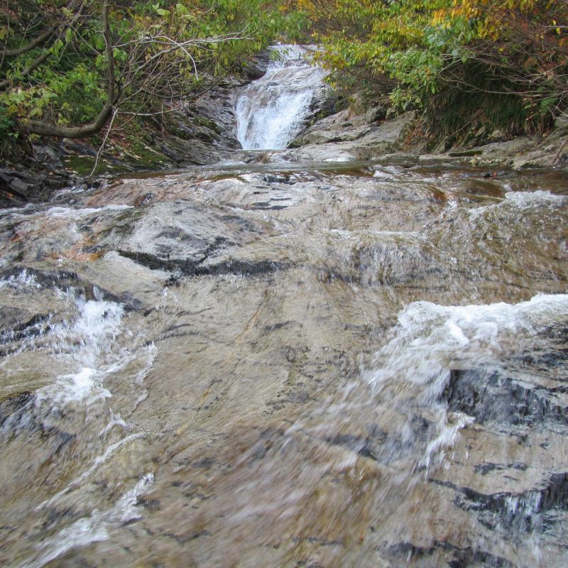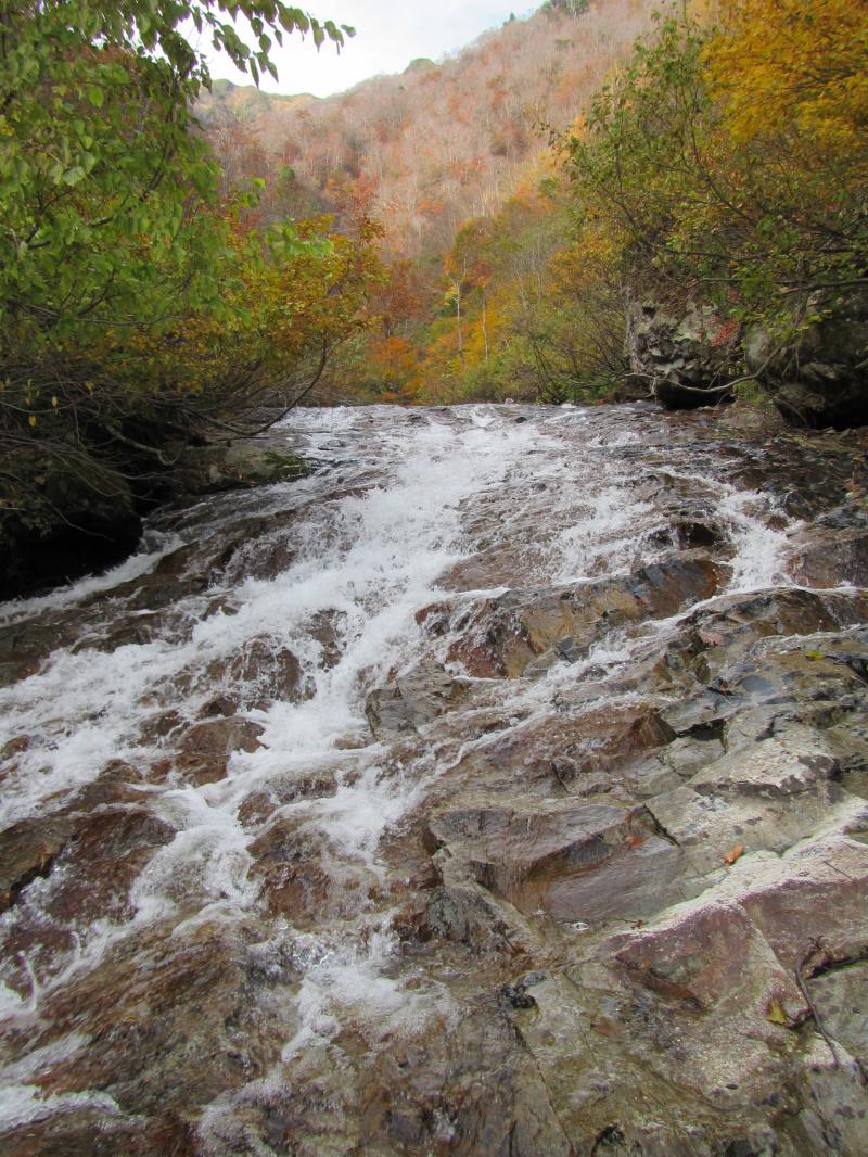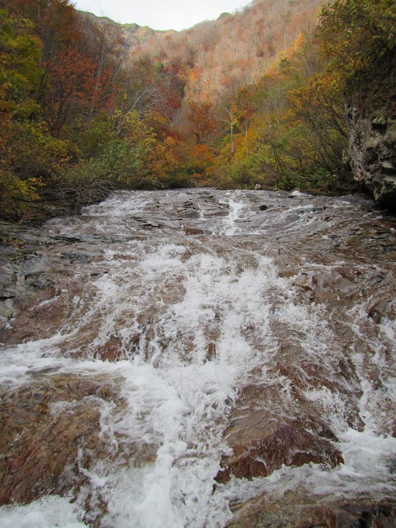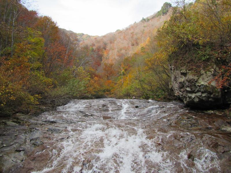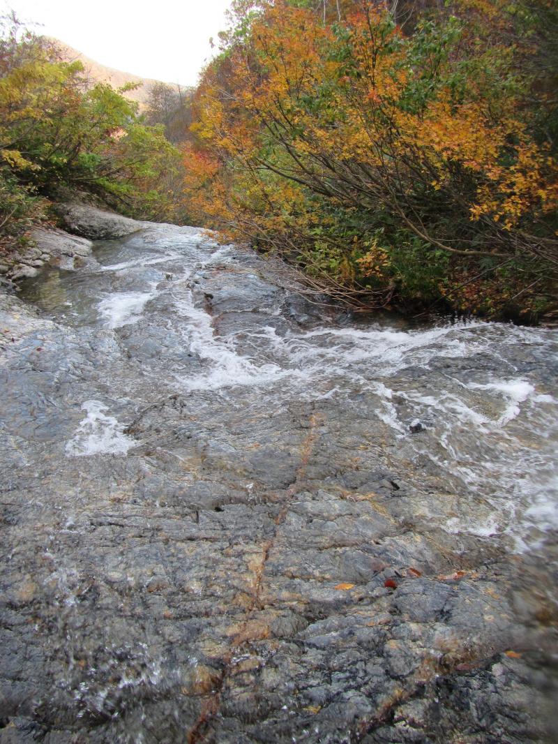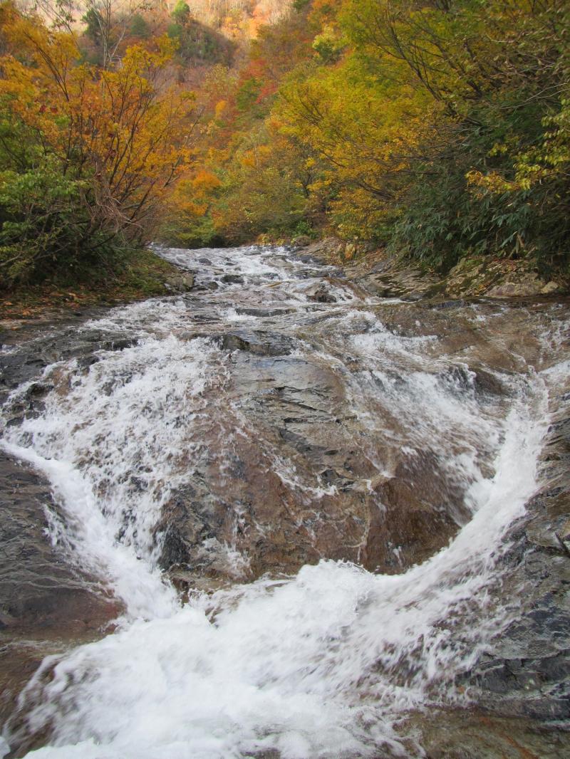 続くナメ状滝12mは落ち葉で滑りやすいので注意が必要。