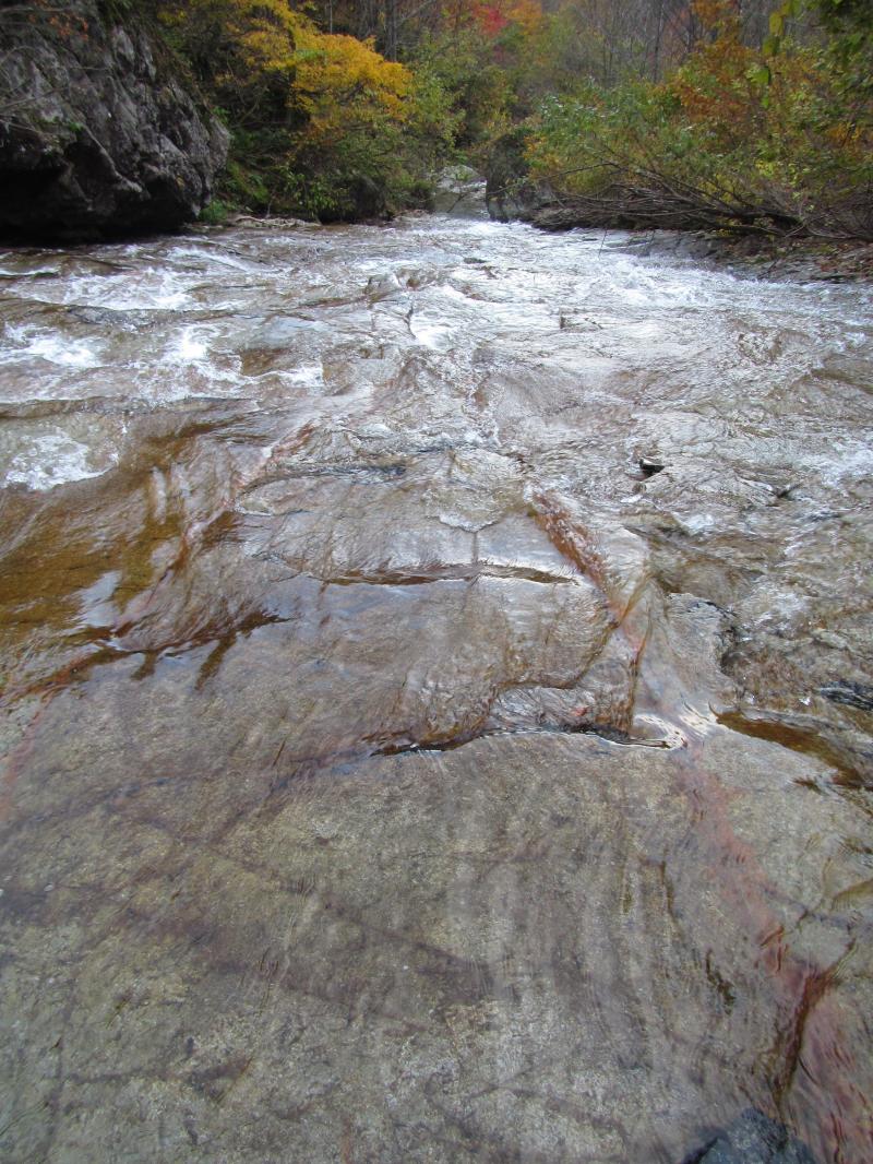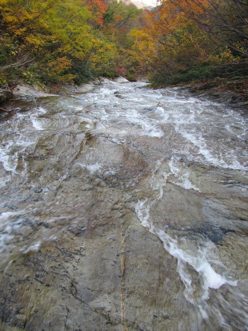 “しばらくゴーロ状を行くと急に沢幅が広がり、10~15mの沢幅一杯に石の絨毯が200mあまり続いている。「大ヒラナメのセン」と呼ばれている所だ。思わず歓声がもれる。”