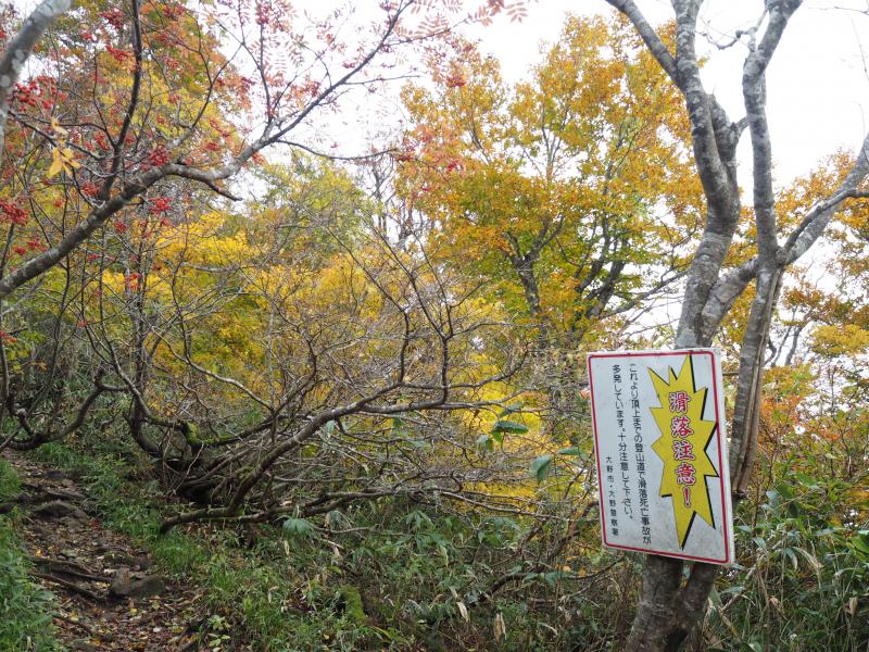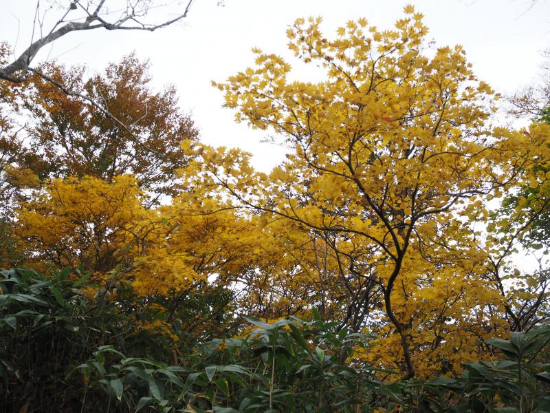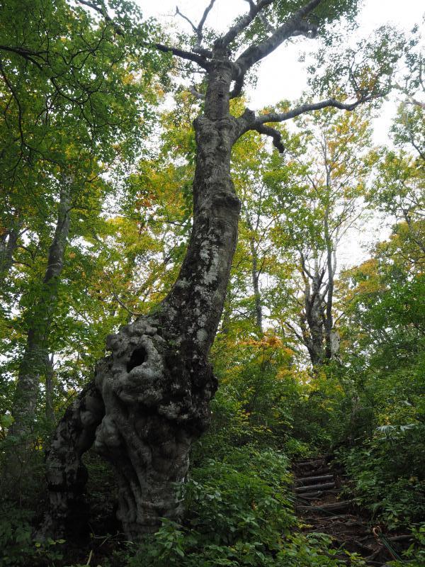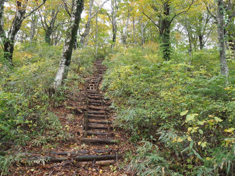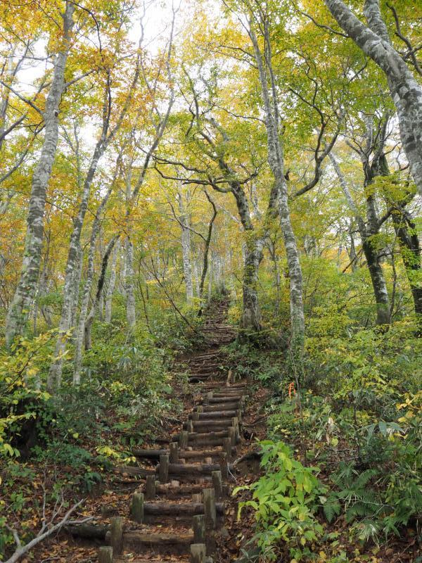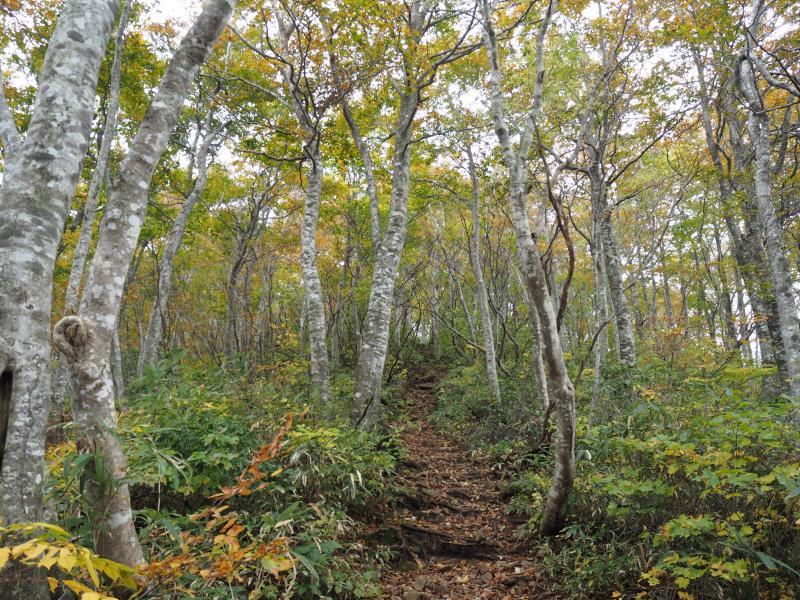 登山口からしばらく登ると現れるブナ林は見事だった。ちょうど紅葉が進んでおりいい雰囲気。なんともいえない森の香りがした。